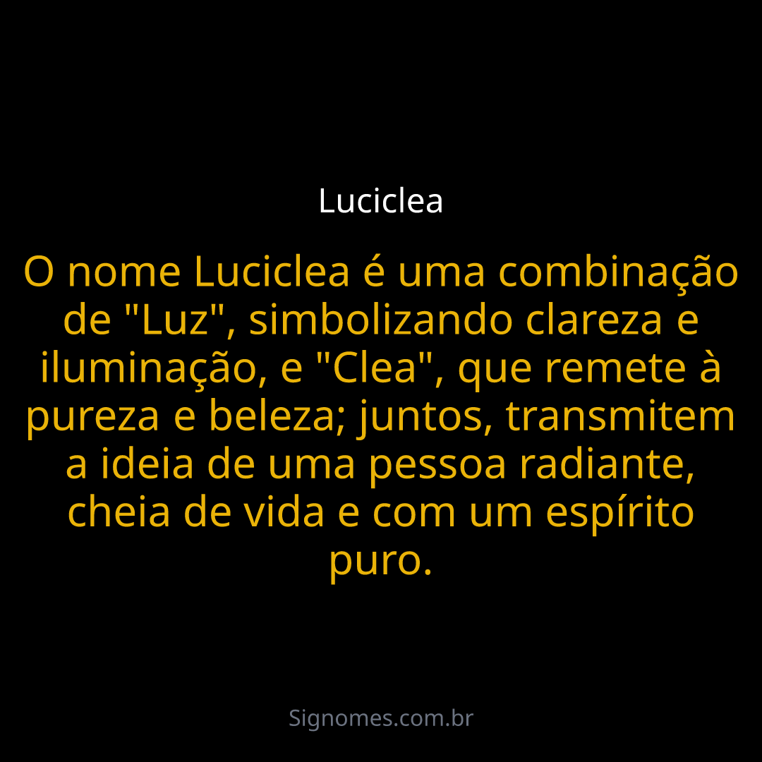 O nome Luciclea é uma combinação de "Luz", simbolizando clareza e iluminação, e "Clea", que remete à pureza e beleza; juntos, transmitem a ideia de uma pessoa radiante, cheia de vida e com um espírito puro.