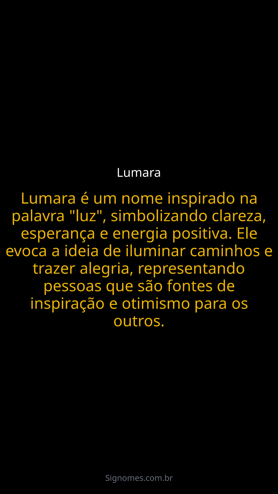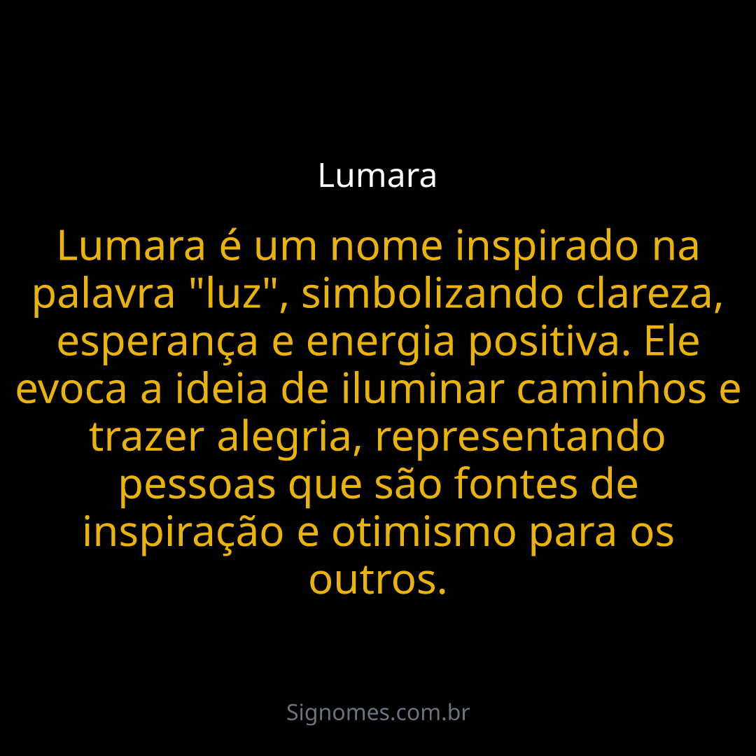 Lumara é um nome inspirado na palavra "luz", simbolizando clareza, esperança e energia positiva. Ele evoca a ideia de iluminar caminhos e trazer alegria, representando pessoas que são fontes de inspiração e otimismo para os outros.