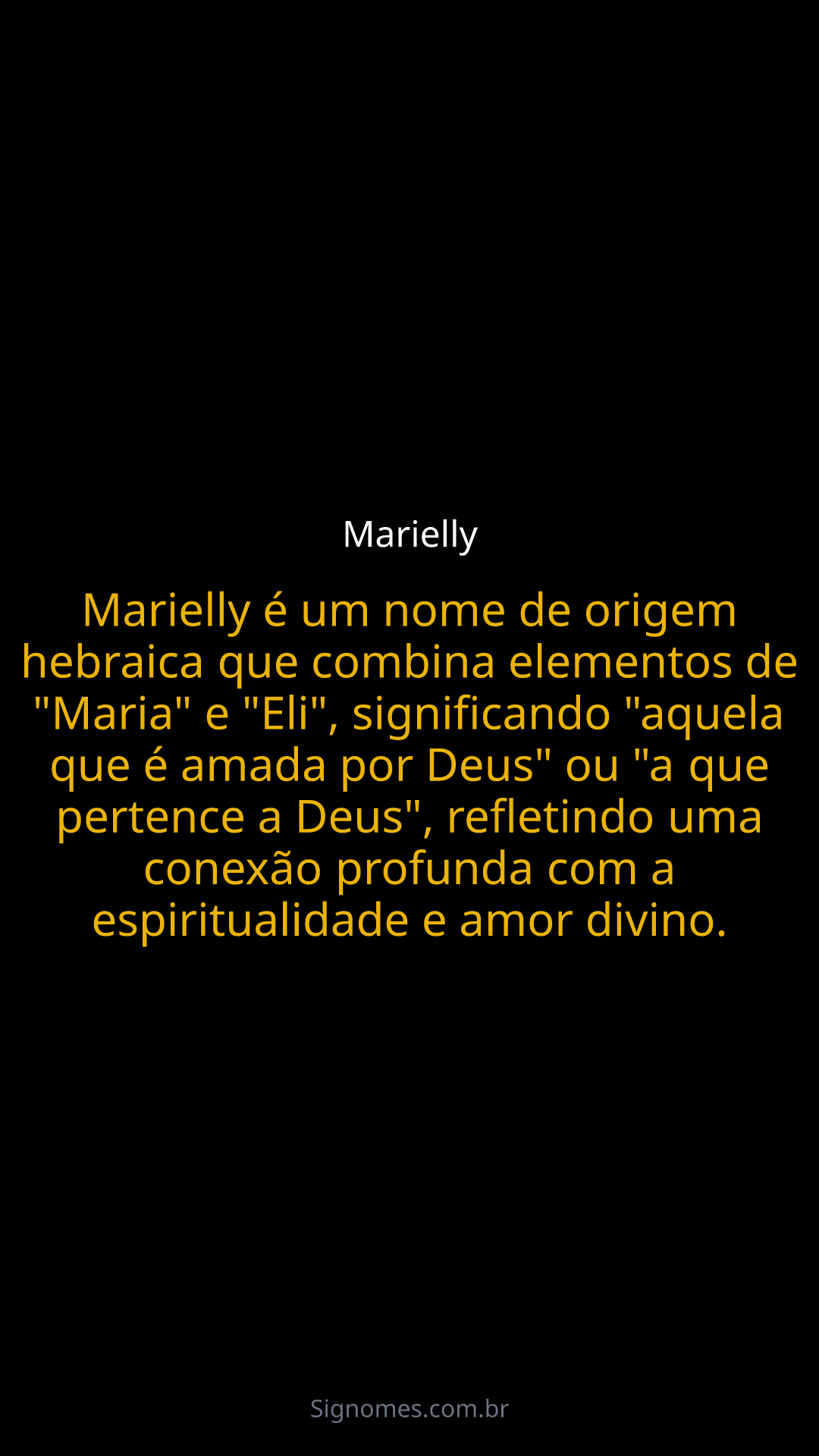 Marielly é um nome de origem hebraica que combina elementos de "Maria" e "Eli", significando "aquela que é amada por Deus" ou "a que pertence a Deus", refletindo uma conexão profunda com a espiritualidade e amor divino.