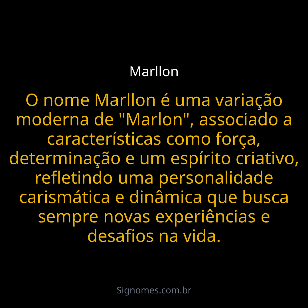 O nome Marllon é uma variação moderna de "Marlon", associado a características como força, determinação e um espírito criativo, refletindo uma personalidade carismática e dinâmica que busca sempre novas experiências e desafios na vida.