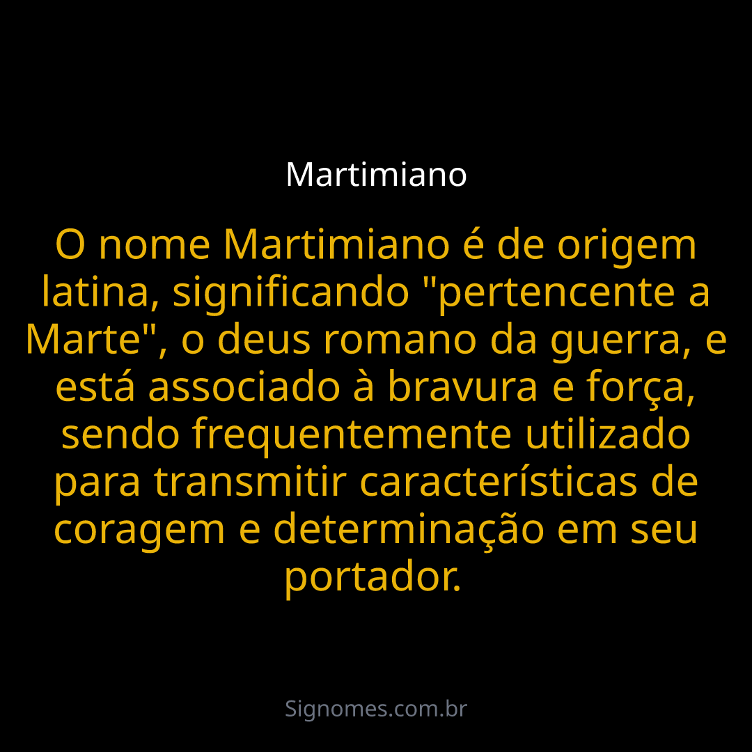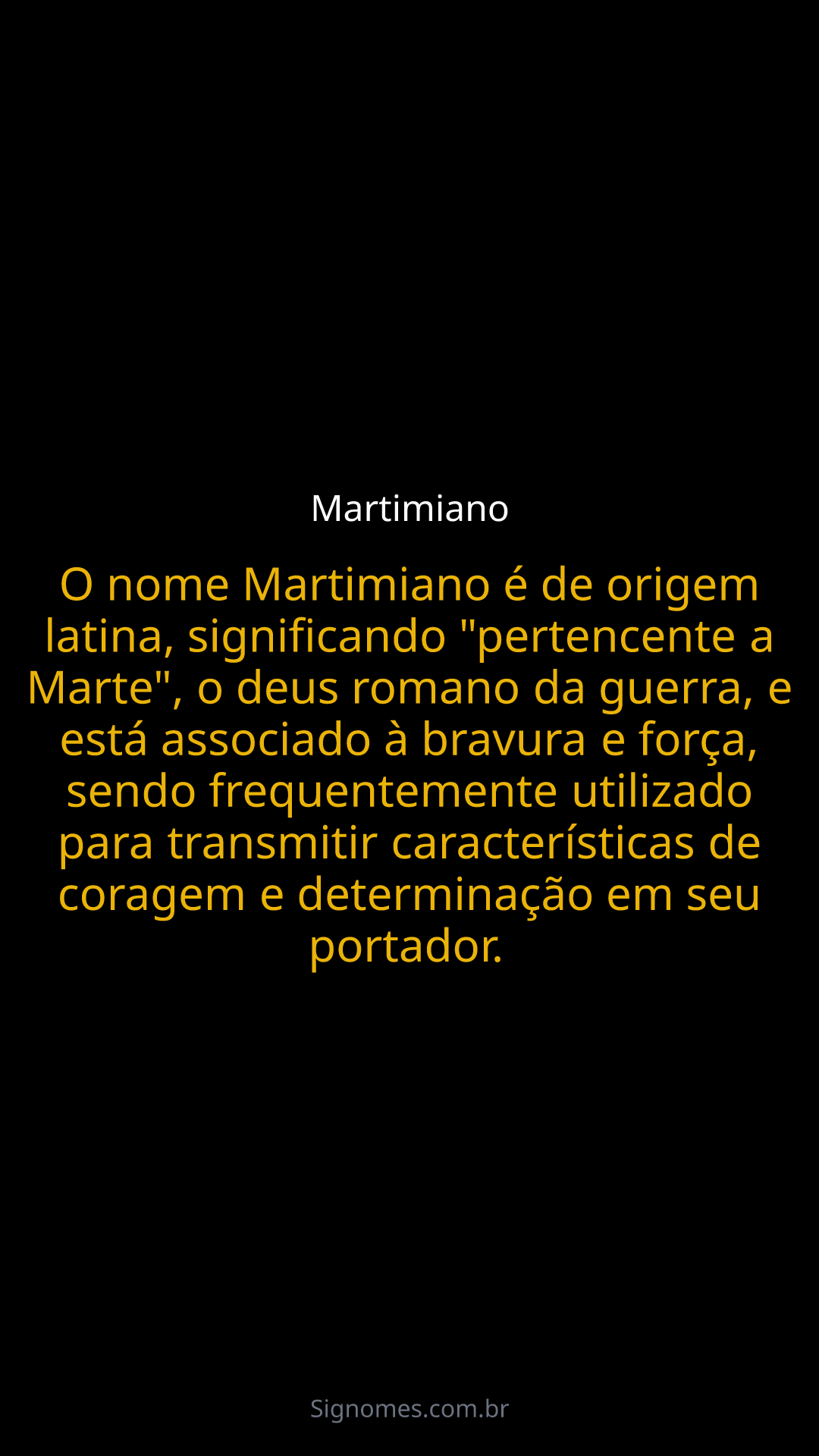 O nome Martimiano é de origem latina, significando "pertencente a Marte", o deus romano da guerra, e está associado à bravura e força, sendo frequentemente utilizado para transmitir características de coragem e determinação em seu portador.