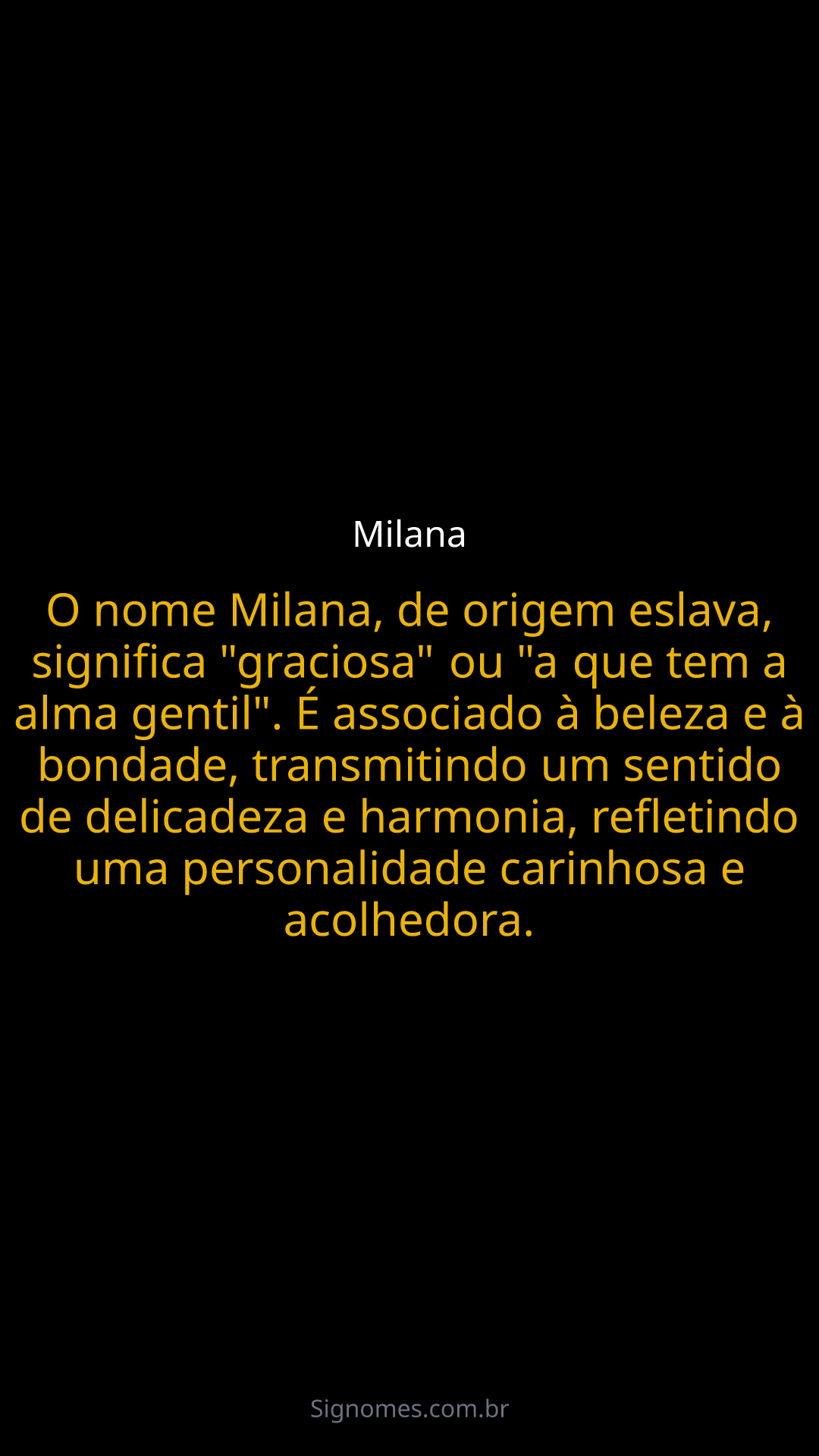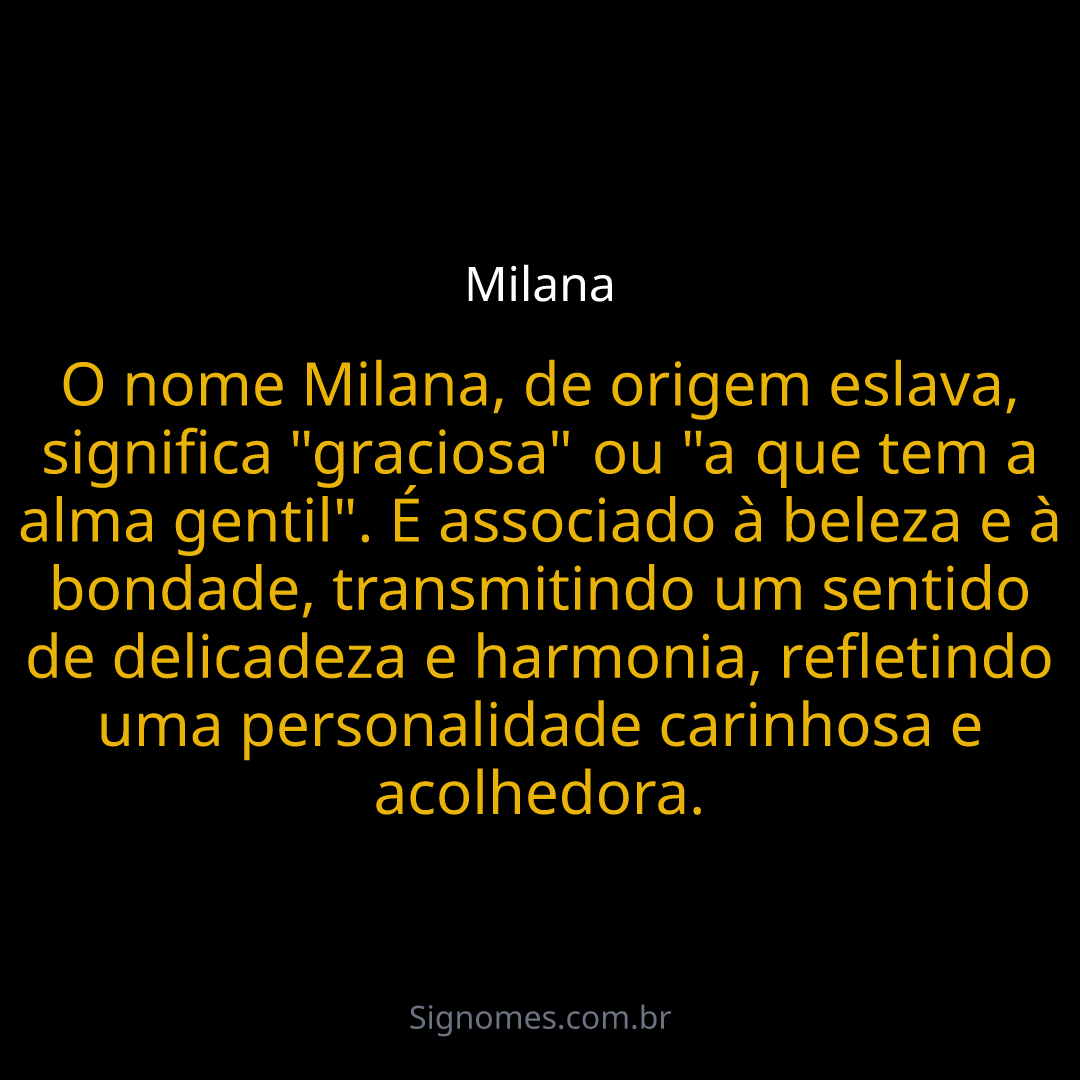 O nome Milana, de origem eslava, significa "graciosa" ou "a que tem a alma gentil". É associado à beleza e à bondade, transmitindo um sentido de delicadeza e harmonia, refletindo uma personalidade carinhosa e acolhedora.