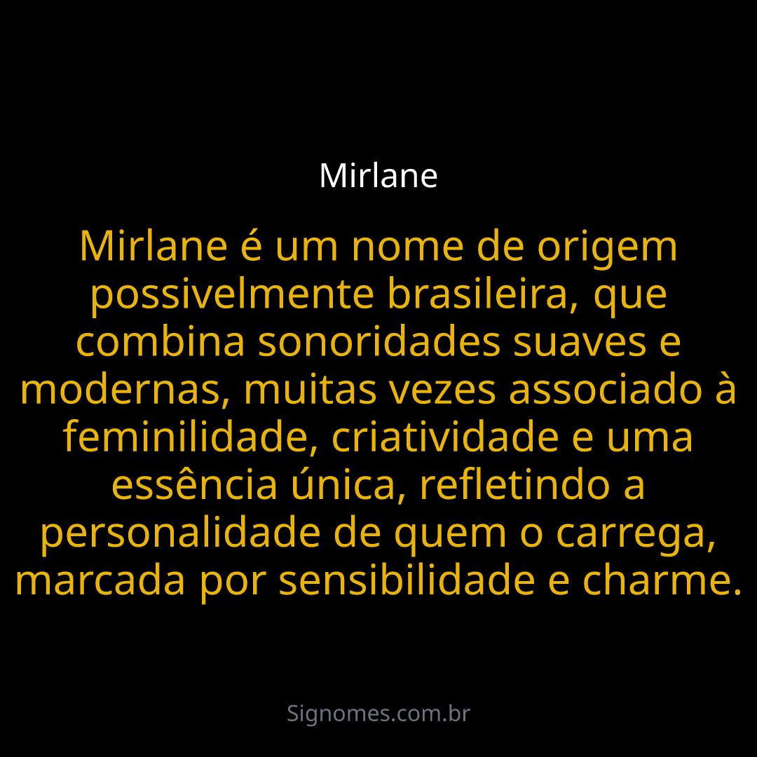 Mirlane é um nome de origem possivelmente brasileira, que combina sonoridades suaves e modernas, muitas vezes associado à feminilidade, criatividade e uma essência única, refletindo a personalidade de quem o carrega, marcada por sensibilidade e charme.