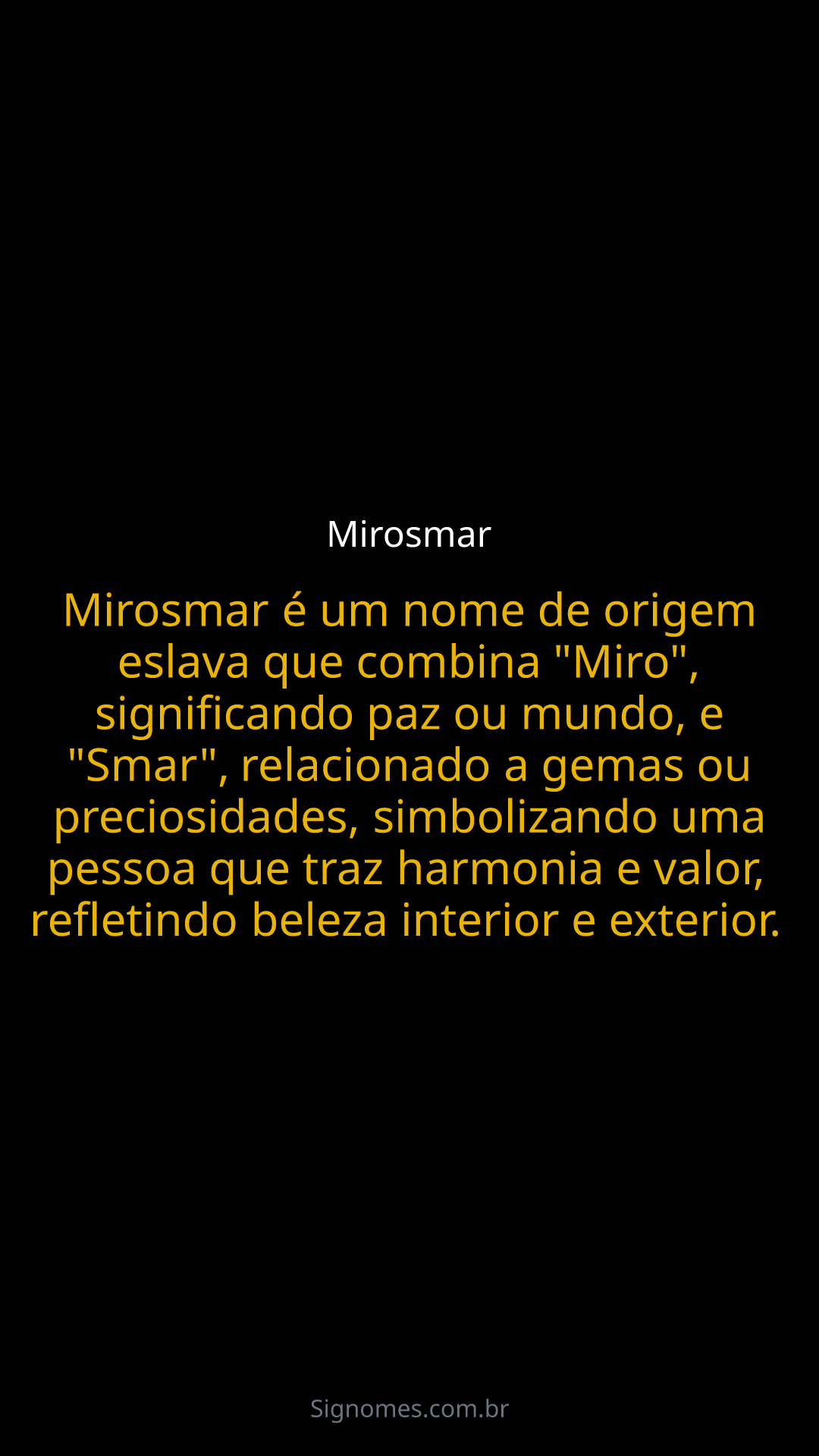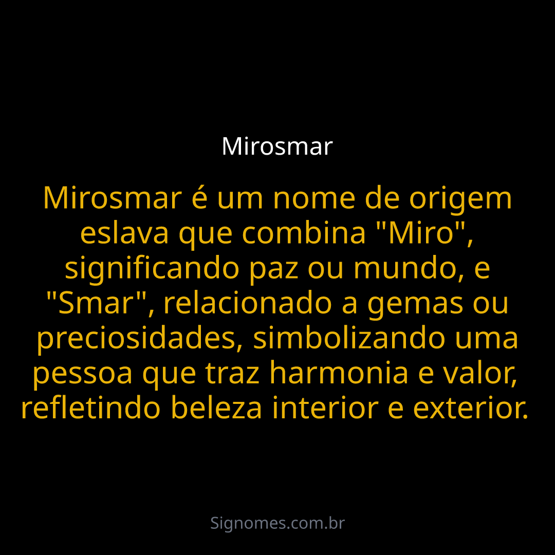 Mirosmar é um nome de origem eslava que combina "Miro", significando paz ou mundo, e "Smar", relacionado a gemas ou preciosidades, simbolizando uma pessoa que traz harmonia e valor, refletindo beleza interior e exterior.