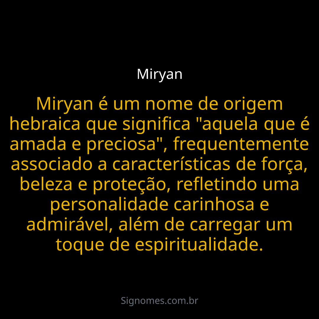 Miryan é um nome de origem hebraica que significa "aquela que é amada e preciosa", frequentemente associado a características de força, beleza e proteção, refletindo uma personalidade carinhosa e admirável, além de carregar um toque de espiritualidade.