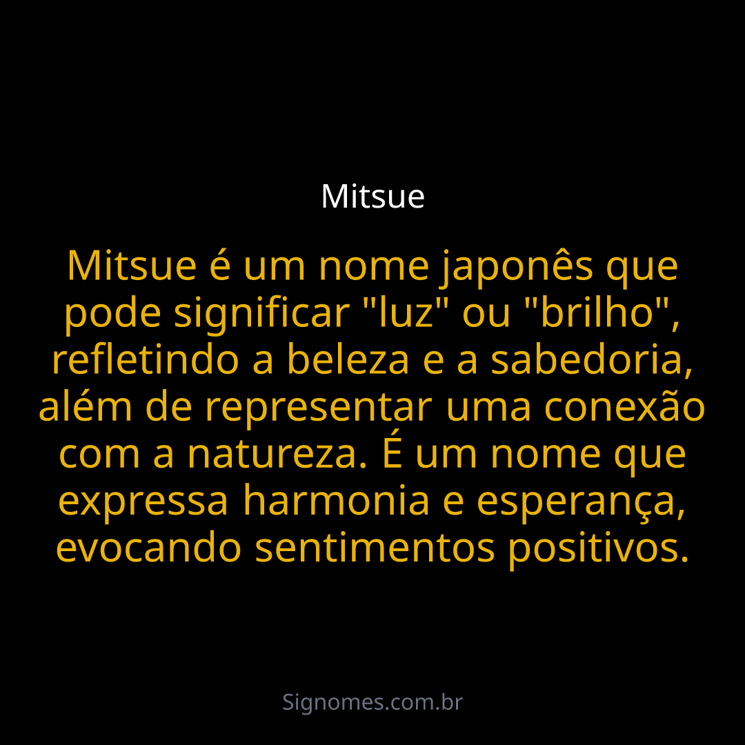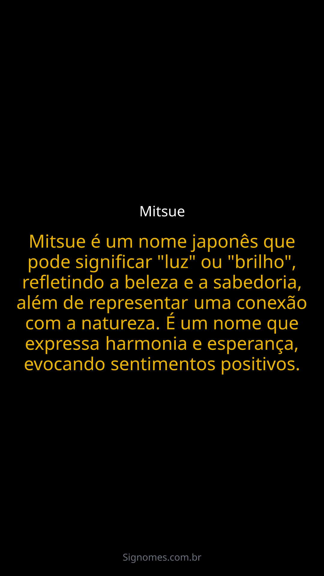 Mitsue é um nome japonês que pode significar "luz" ou "brilho", refletindo a beleza e a sabedoria, além de representar uma conexão com a natureza. É um nome que expressa harmonia e esperança, evocando sentimentos positivos.