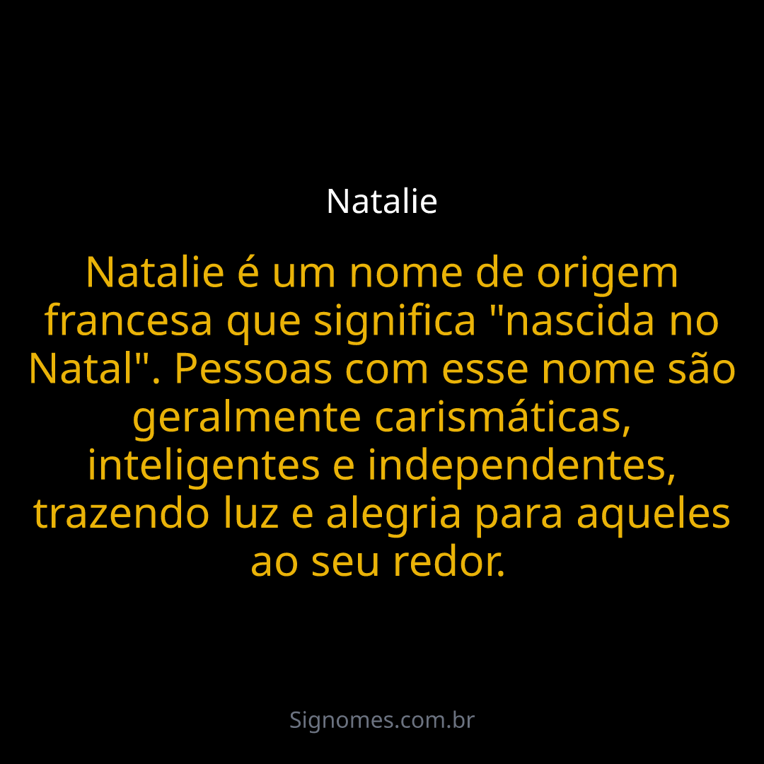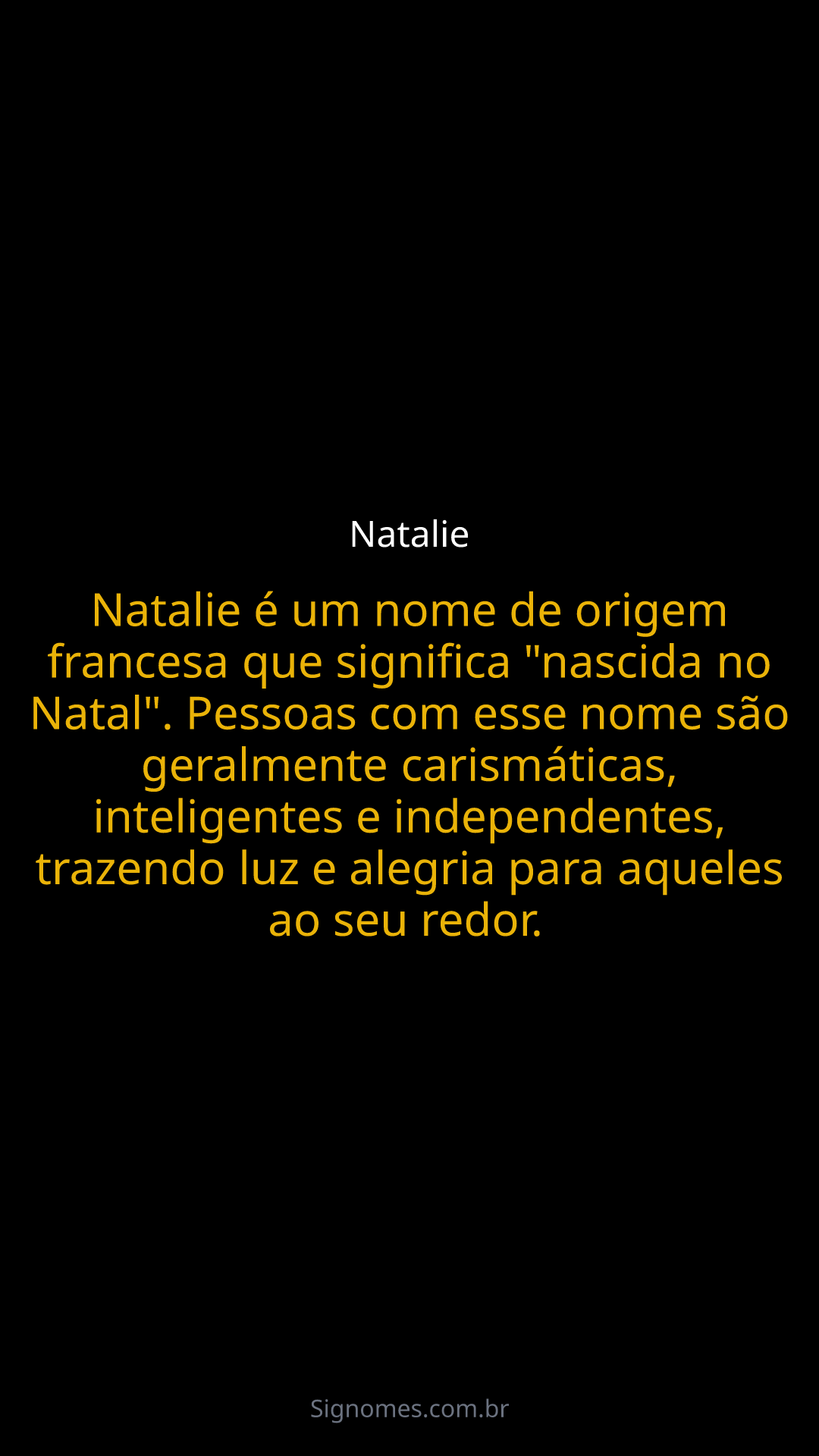 Natalie é um nome de origem francesa que significa "nascida no Natal". Pessoas com esse nome são geralmente carismáticas, inteligentes e independentes, trazendo luz e alegria para aqueles ao seu redor.