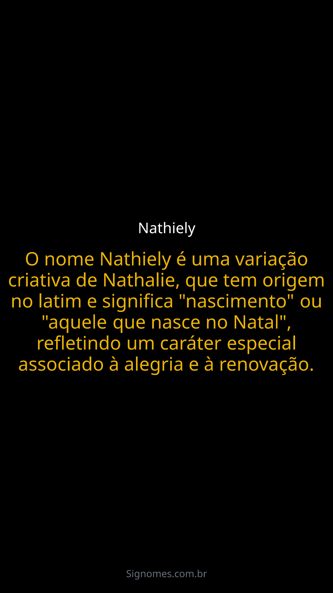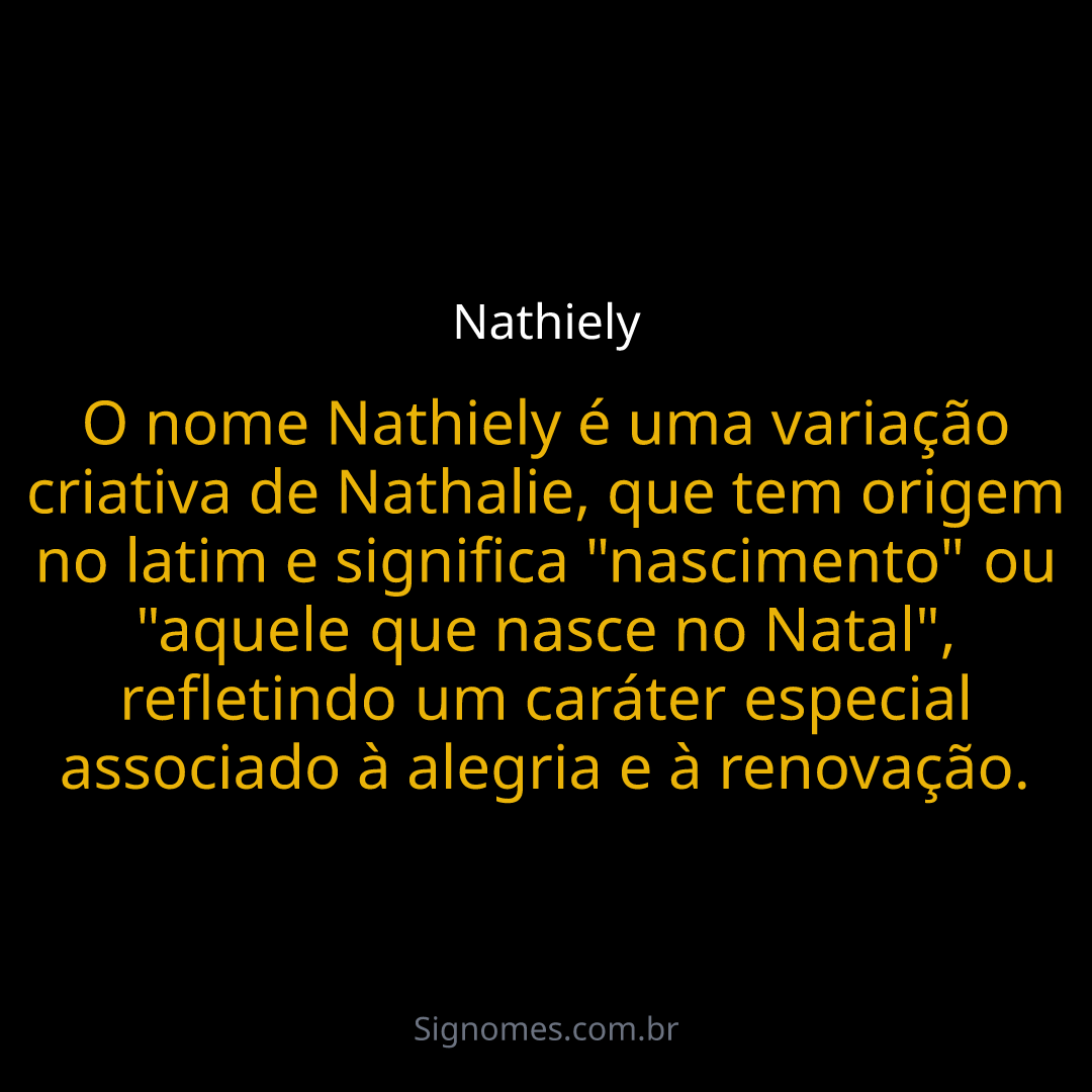 O nome Nathiely é uma variação criativa de Nathalie, que tem origem no latim e significa "nascimento" ou "aquele que nasce no Natal", refletindo um caráter especial associado à alegria e à renovação.