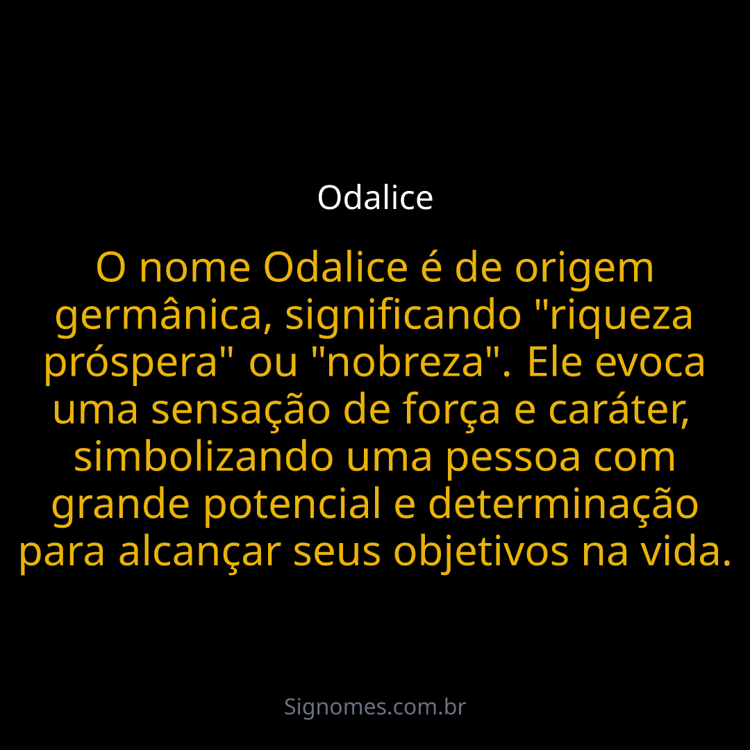 O nome Odalice é de origem germânica, significando "riqueza próspera" ou "nobreza". Ele evoca uma sensação de força e caráter, simbolizando uma pessoa com grande potencial e determinação para alcançar seus objetivos na vida.