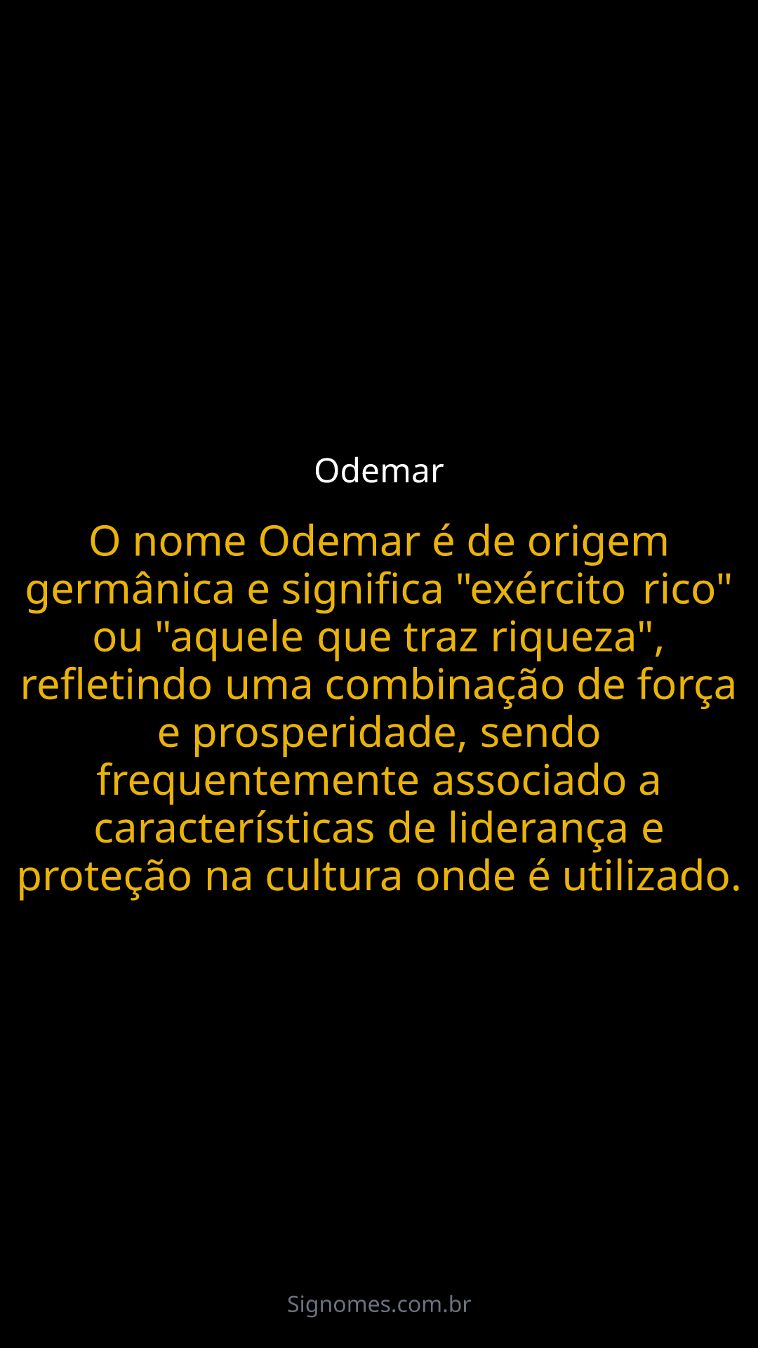 O nome Odemar é de origem germânica e significa "exército rico" ou "aquele que traz riqueza", refletindo uma combinação de força e prosperidade, sendo frequentemente associado a características de liderança e proteção na cultura onde é utilizado.