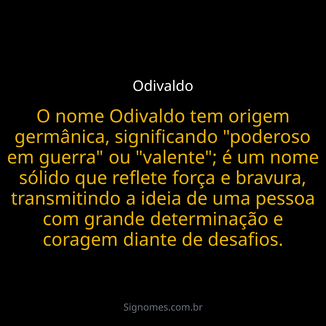 O nome Odivaldo tem origem germânica, significando "poderoso em guerra" ou "valente"; é um nome sólido que reflete força e bravura, transmitindo a ideia de uma pessoa com grande determinação e coragem diante de desafios.