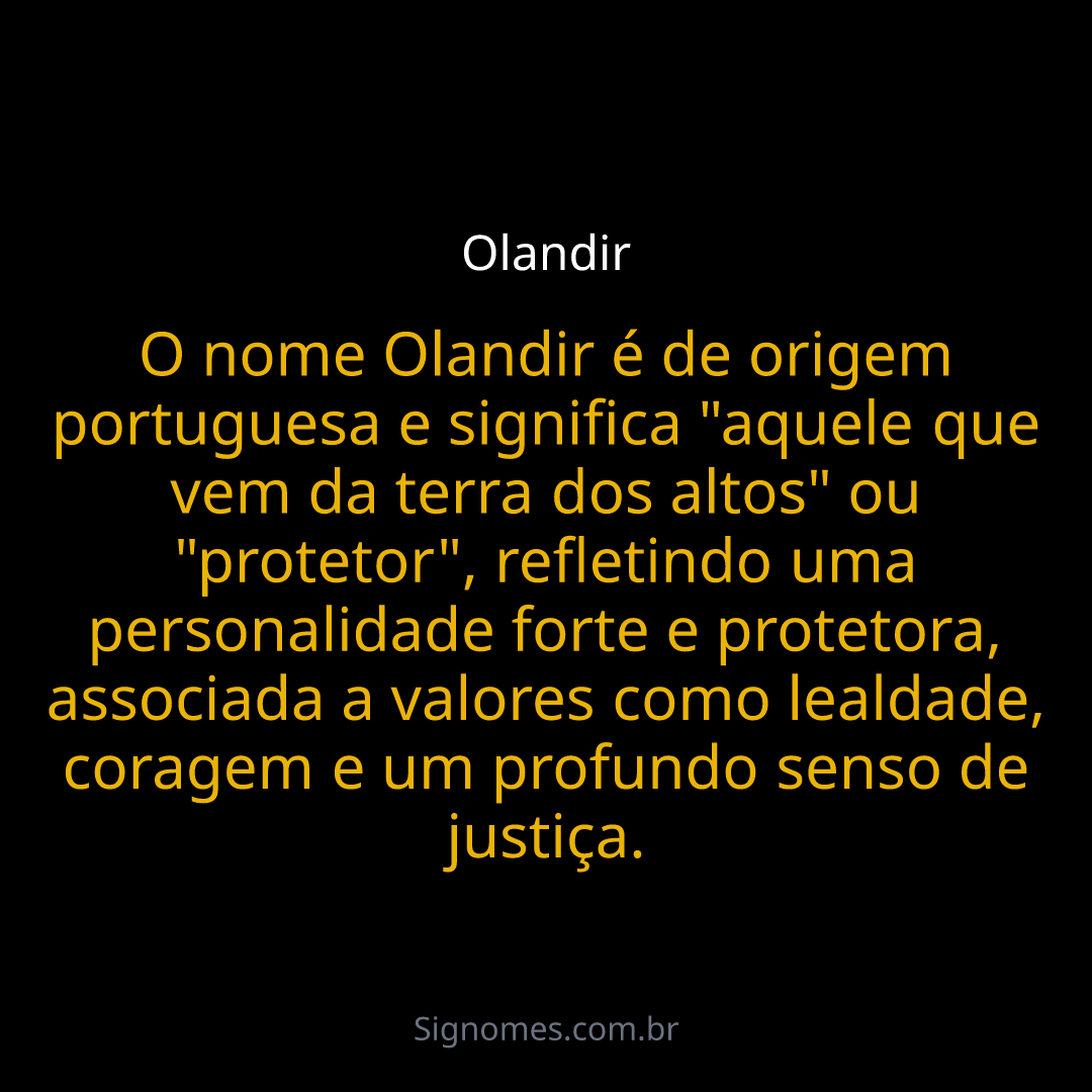 O nome Olandir é de origem portuguesa e significa "aquele que vem da terra dos altos" ou "protetor", refletindo uma personalidade forte e protetora, associada a valores como lealdade, coragem e um profundo senso de justiça.