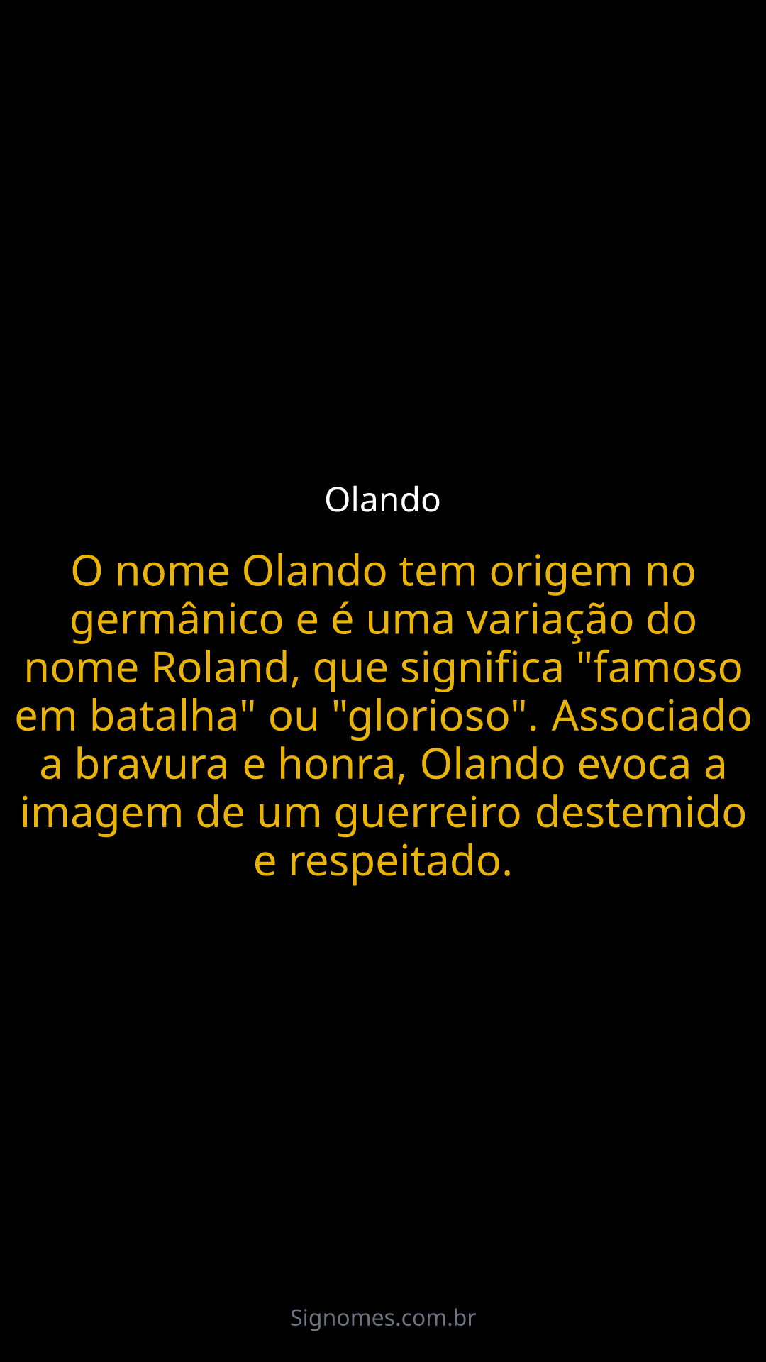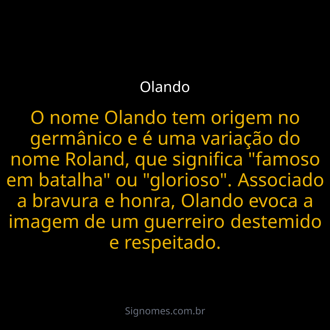 O nome Olando tem origem no germânico e é uma variação do nome Roland, que significa "famoso em batalha" ou "glorioso". Associado a bravura e honra, Olando evoca a imagem de um guerreiro destemido e respeitado.