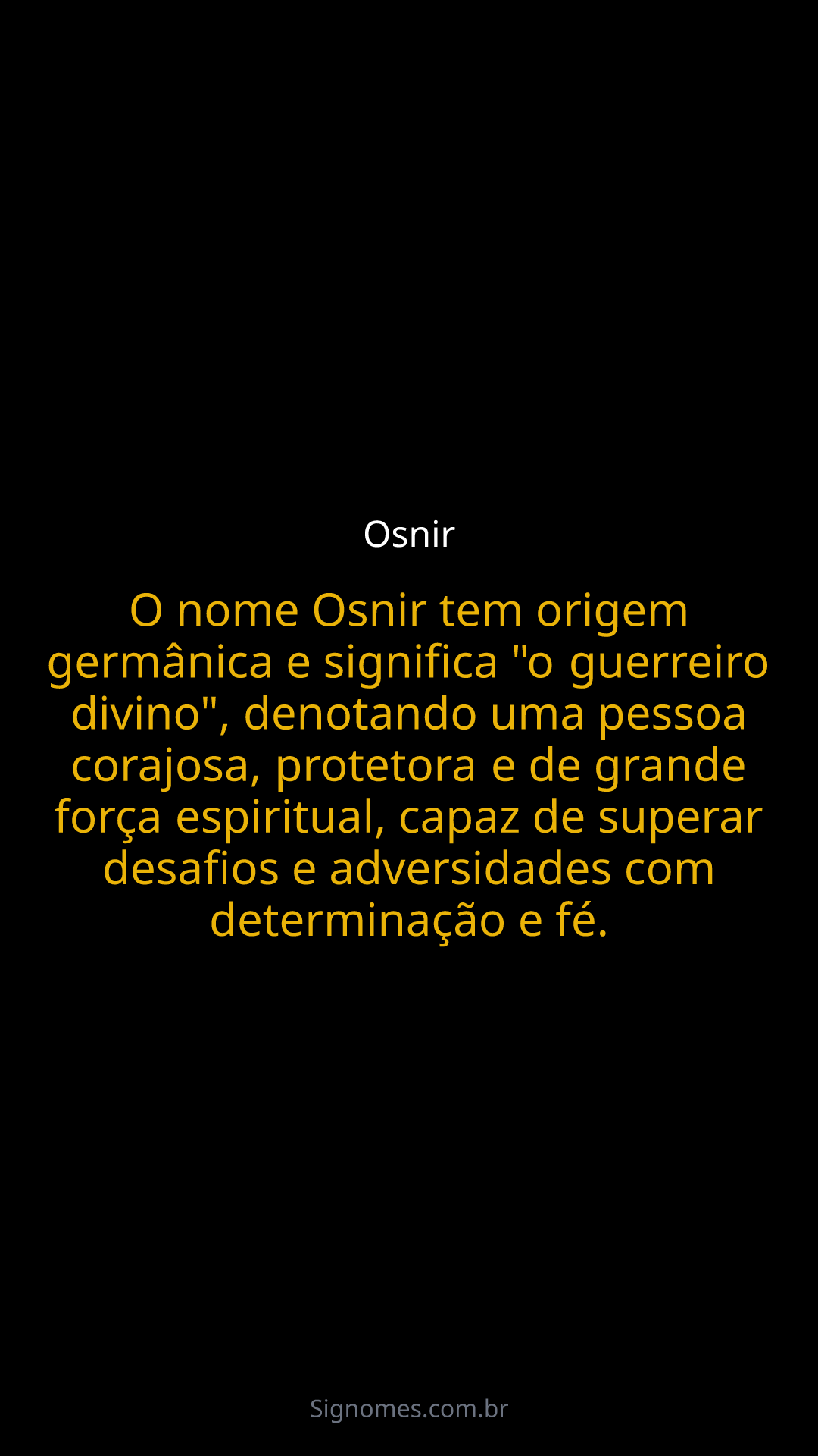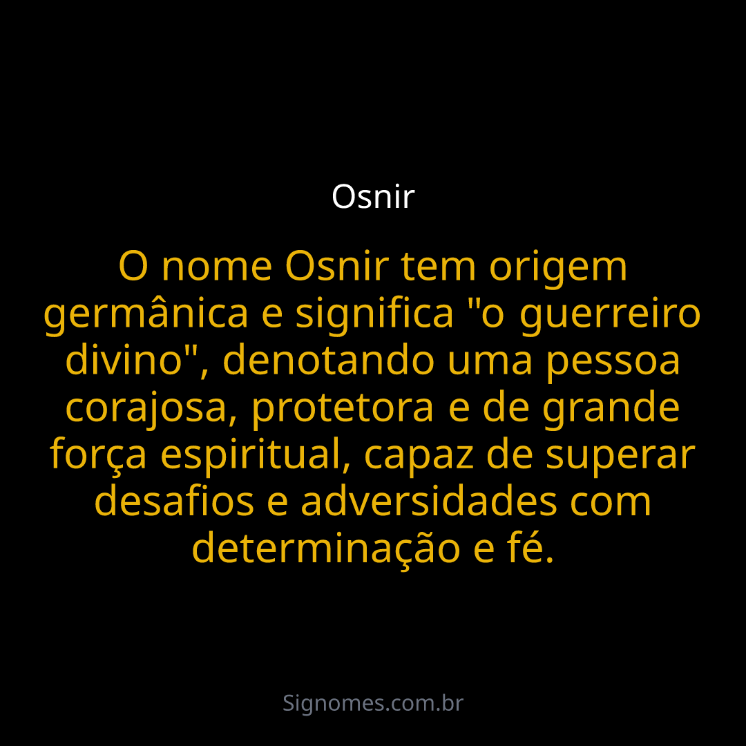 O nome Osnir tem origem germânica e significa "o guerreiro divino", denotando uma pessoa corajosa, protetora e de grande força espiritual, capaz de superar desafios e adversidades com determinação e fé.