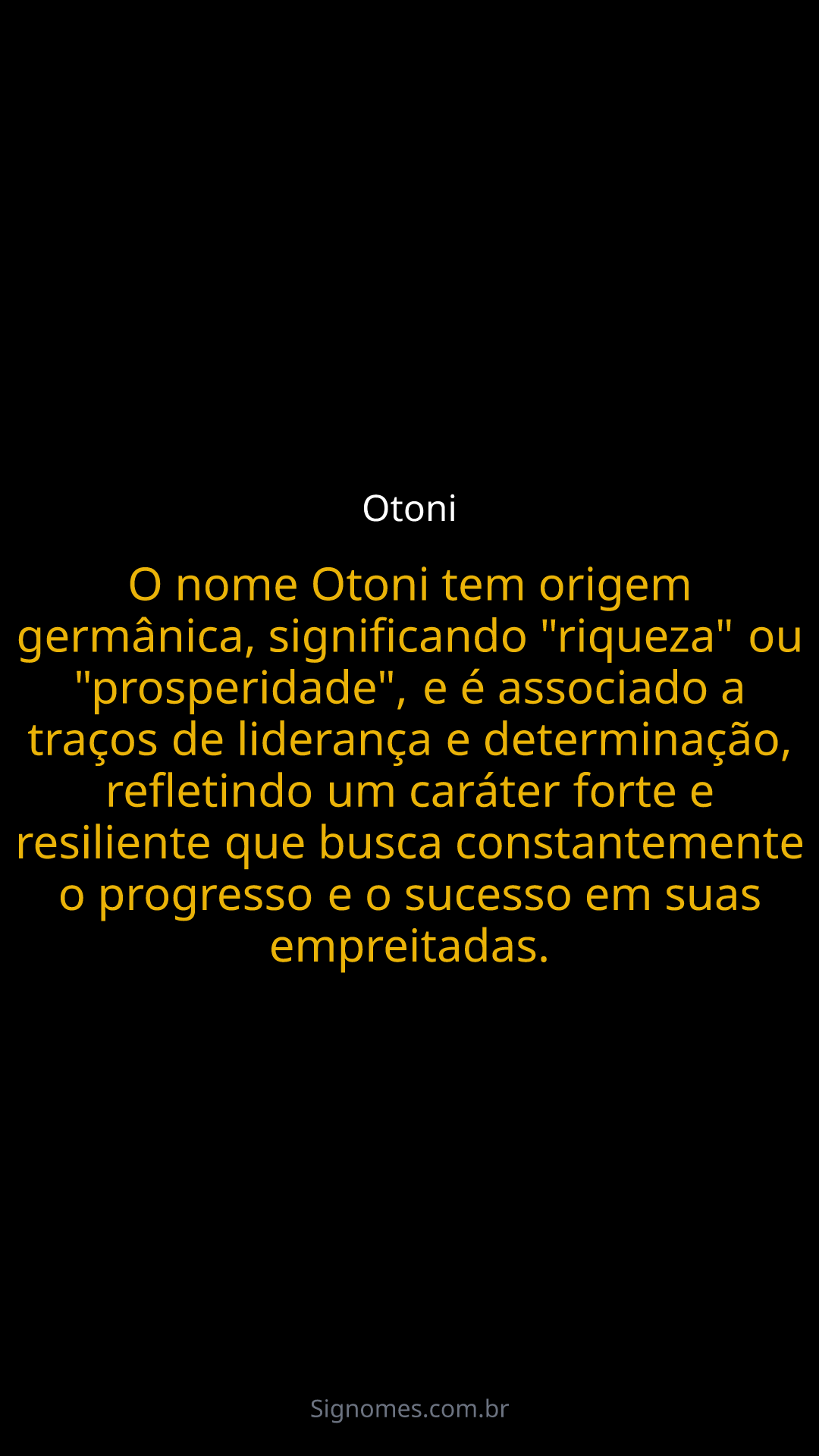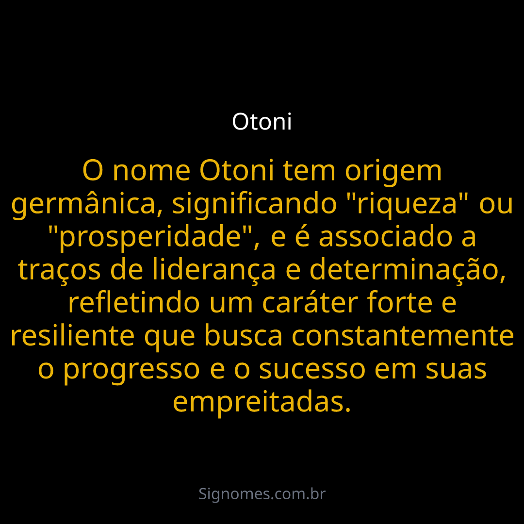 O nome Otoni tem origem germânica, significando "riqueza" ou "prosperidade", e é associado a traços de liderança e determinação, refletindo um caráter forte e resiliente que busca constantemente o progresso e o sucesso em suas empreitadas.