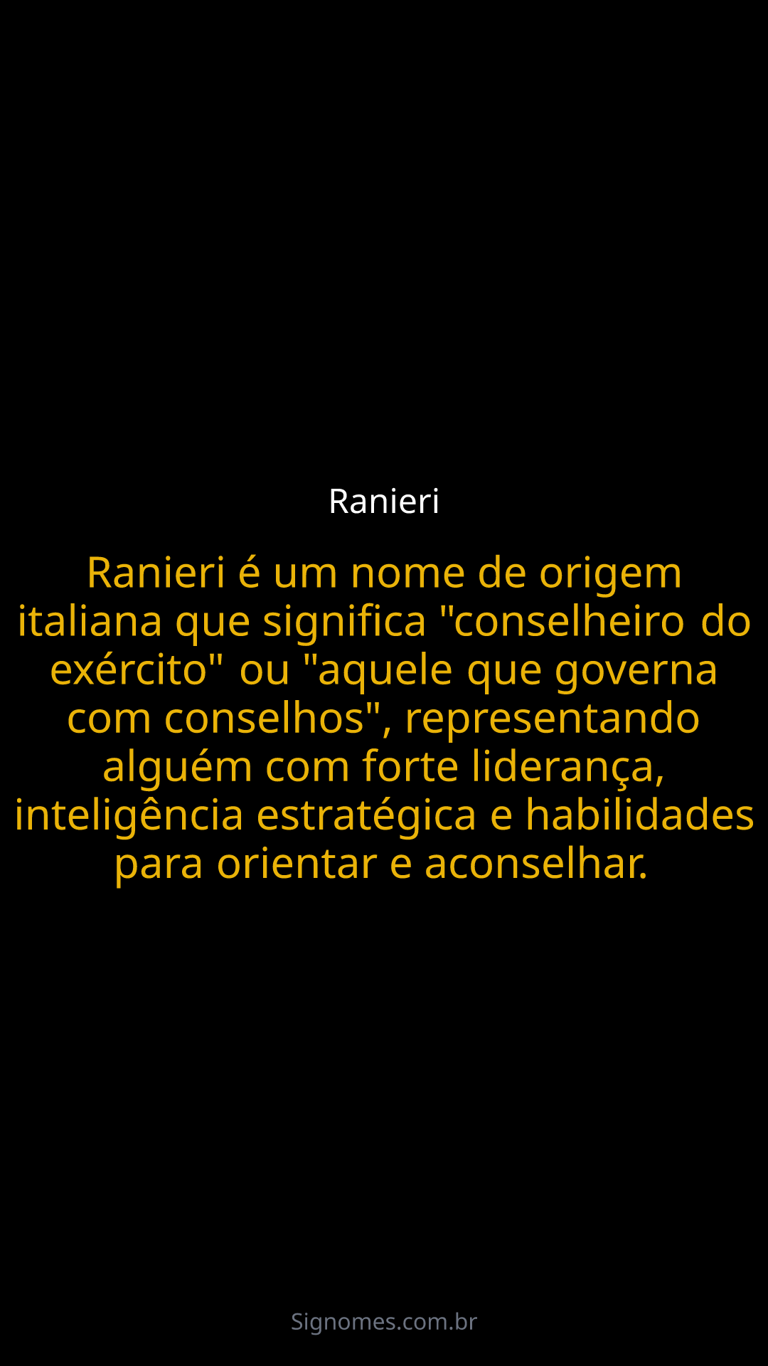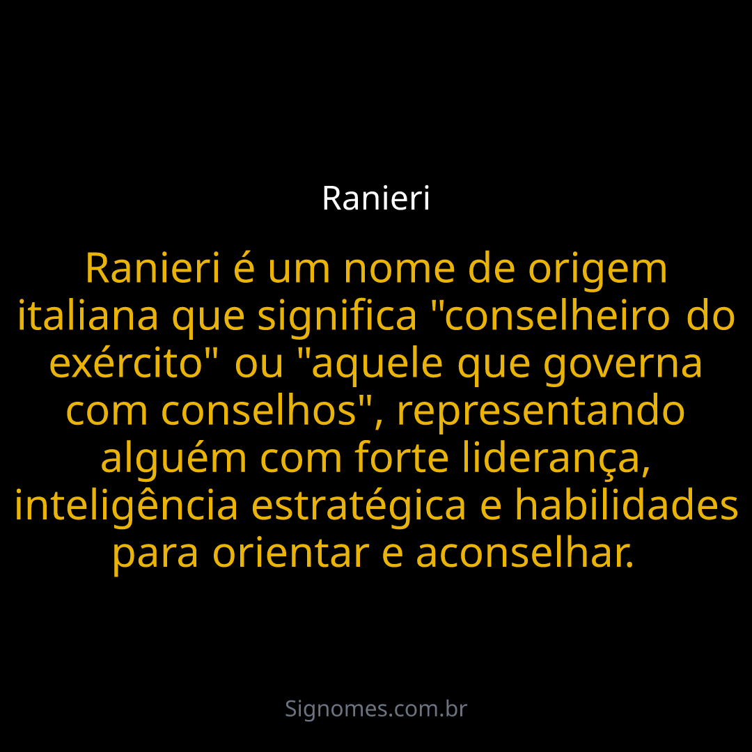 Ranieri é um nome de origem italiana que significa "conselheiro do exército" ou "aquele que governa com conselhos", representando alguém com forte liderança, inteligência estratégica e habilidades para orientar e aconselhar.