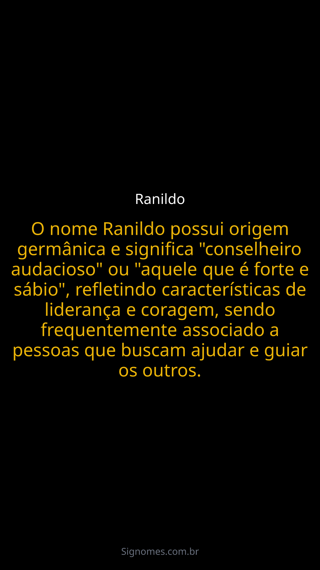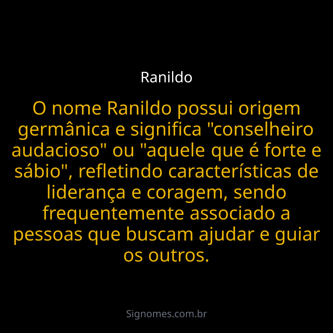 O nome Ranildo possui origem germânica e significa "conselheiro audacioso" ou "aquele que é forte e sábio", refletindo características de liderança e coragem, sendo frequentemente associado a pessoas que buscam ajudar e guiar os outros.