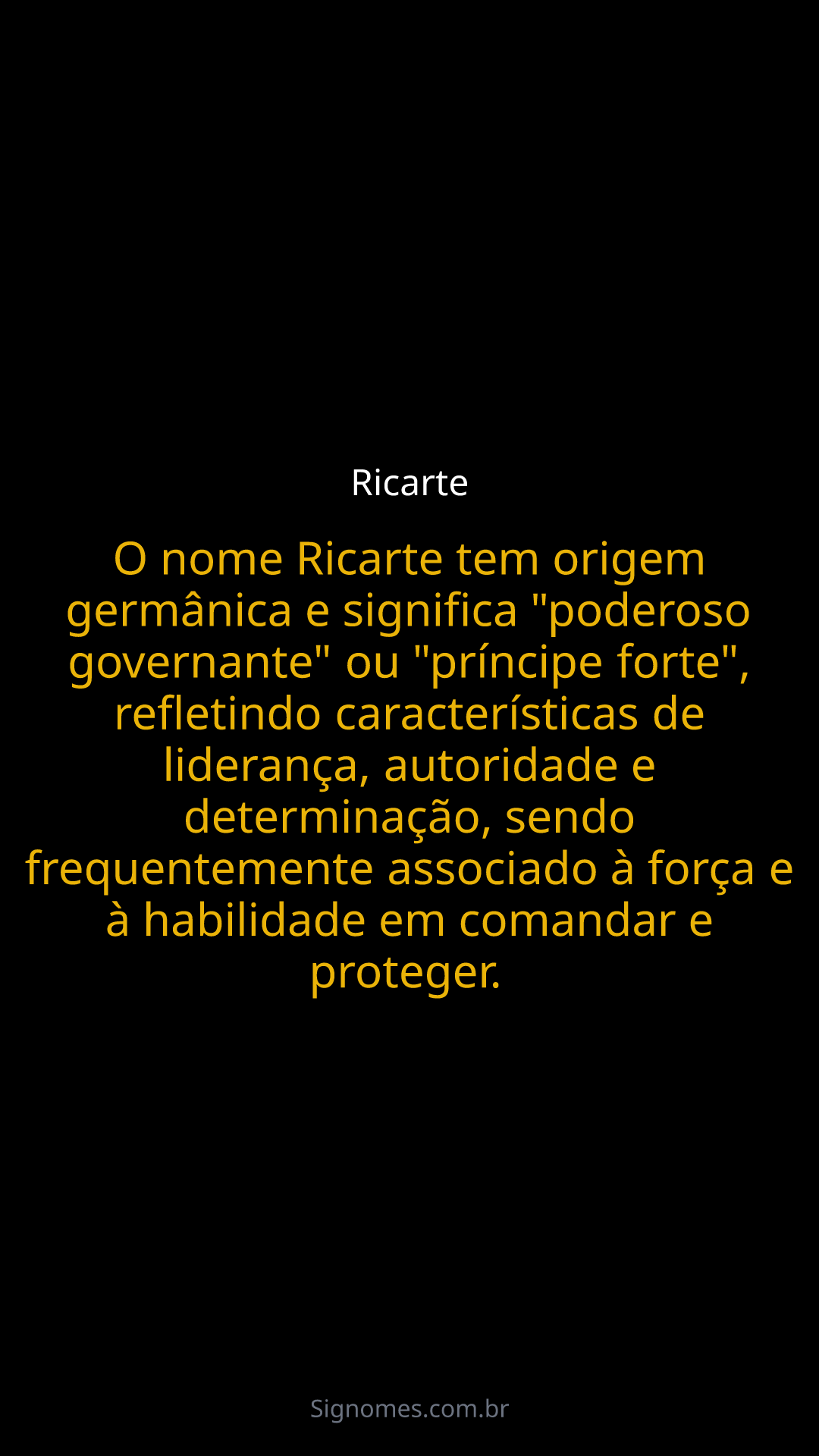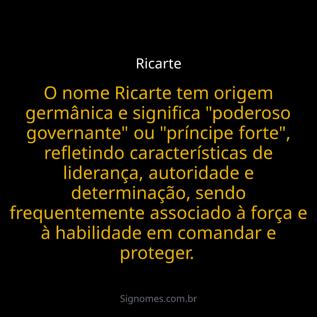 O nome Ricarte tem origem germânica e significa "poderoso governante" ou "príncipe forte", refletindo características de liderança, autoridade e determinação, sendo frequentemente associado à força e à habilidade em comandar e proteger.