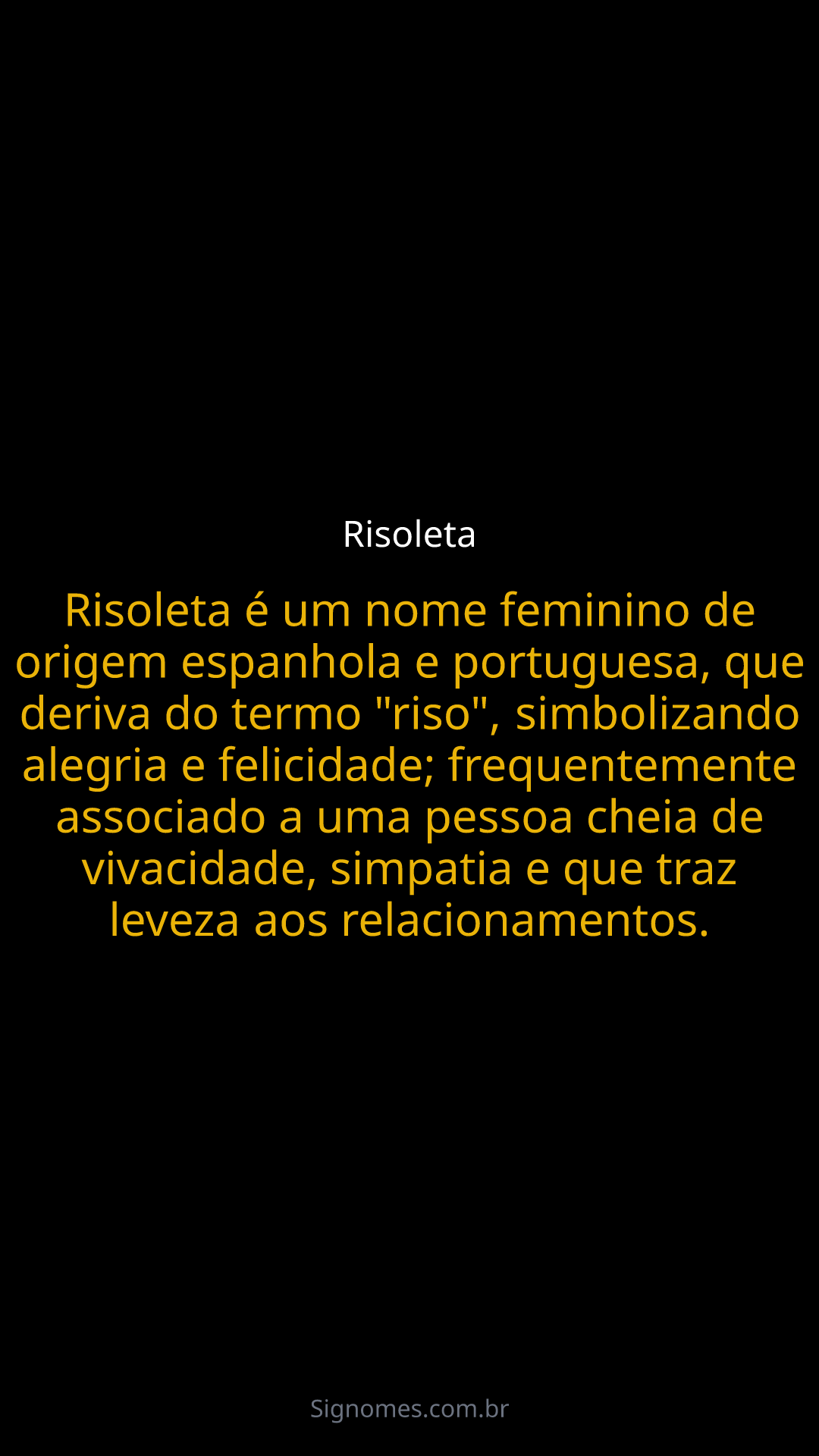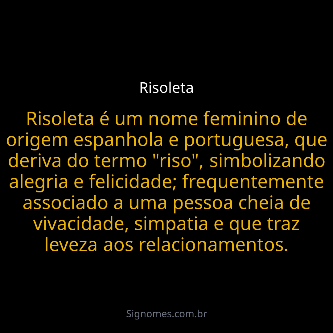 Risoleta é um nome feminino de origem espanhola e portuguesa, que deriva do termo "riso", simbolizando alegria e felicidade; frequentemente associado a uma pessoa cheia de vivacidade, simpatia e que traz leveza aos relacionamentos.