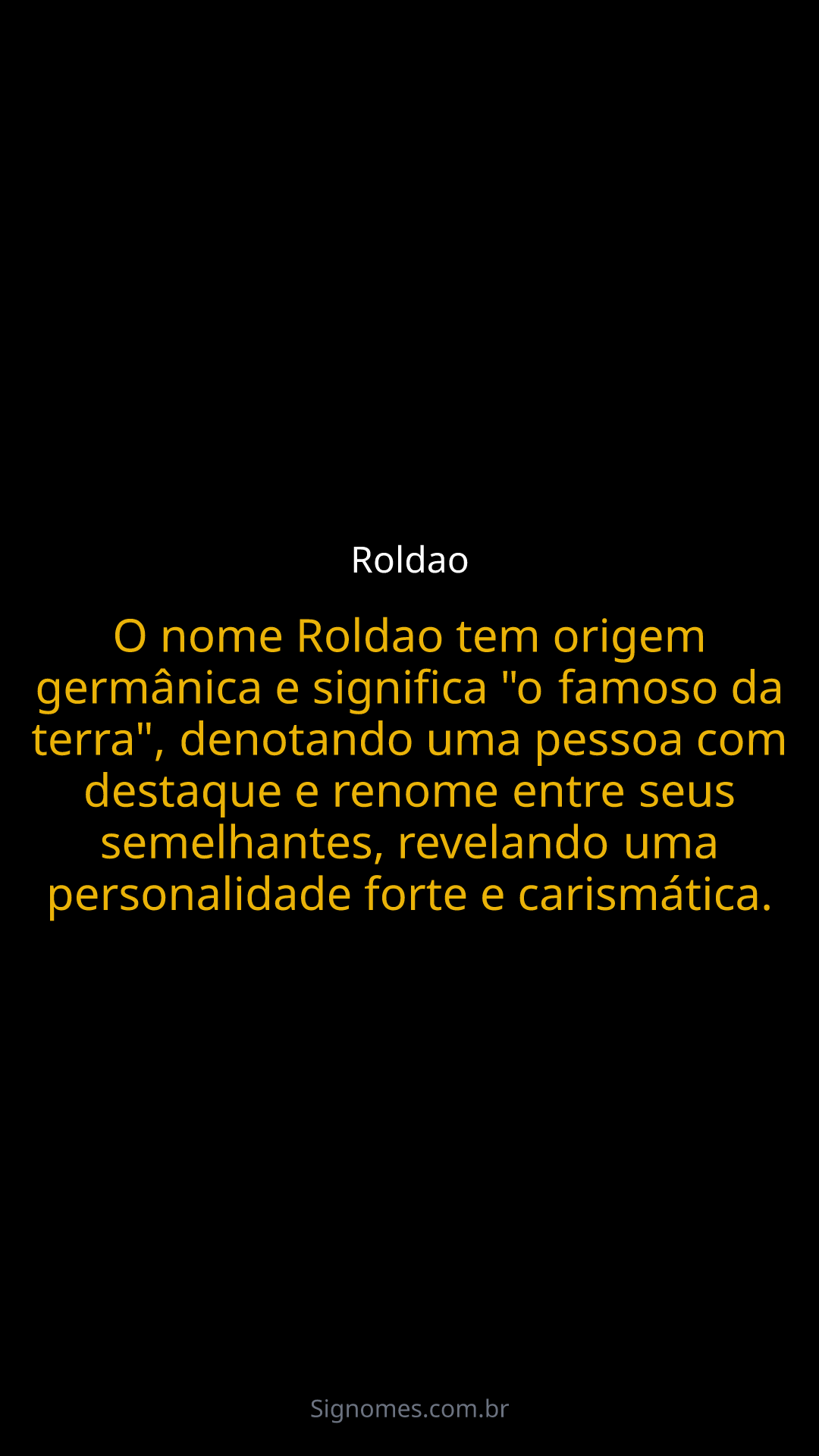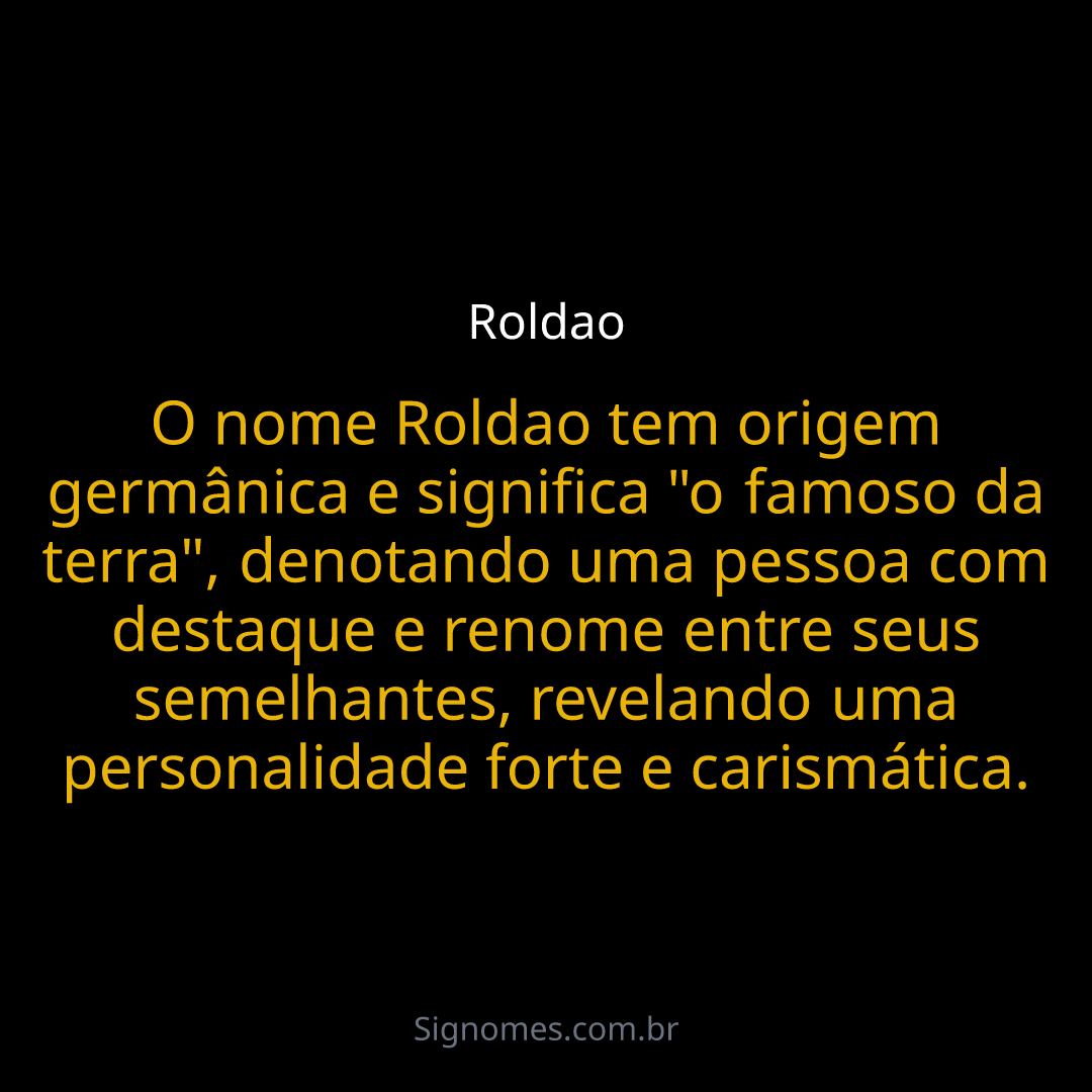 O nome Roldao tem origem germânica e significa "o famoso da terra", denotando uma pessoa com destaque e renome entre seus semelhantes, revelando uma personalidade forte e carismática.