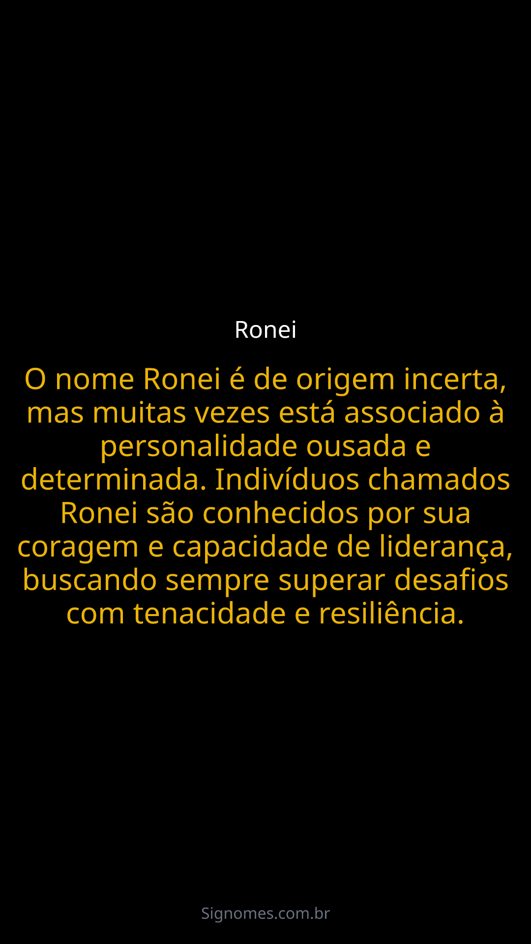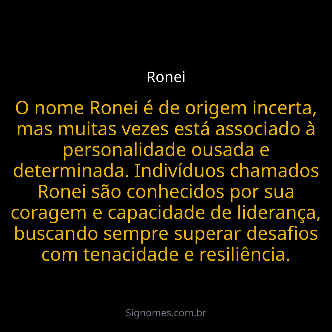 O nome Ronei é de origem incerta, mas muitas vezes está associado à personalidade ousada e determinada. Indivíduos chamados Ronei são conhecidos por sua coragem e capacidade de liderança, buscando sempre superar desafios com tenacidade e resiliência.
