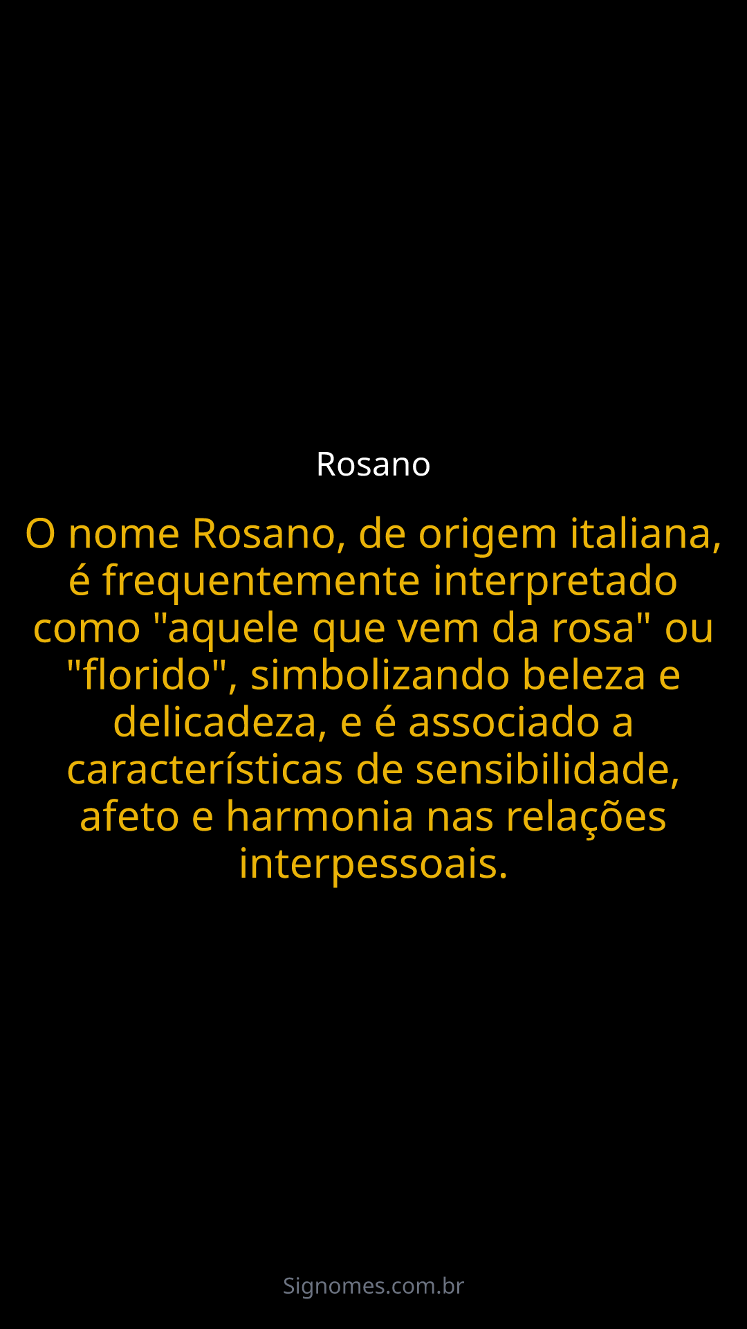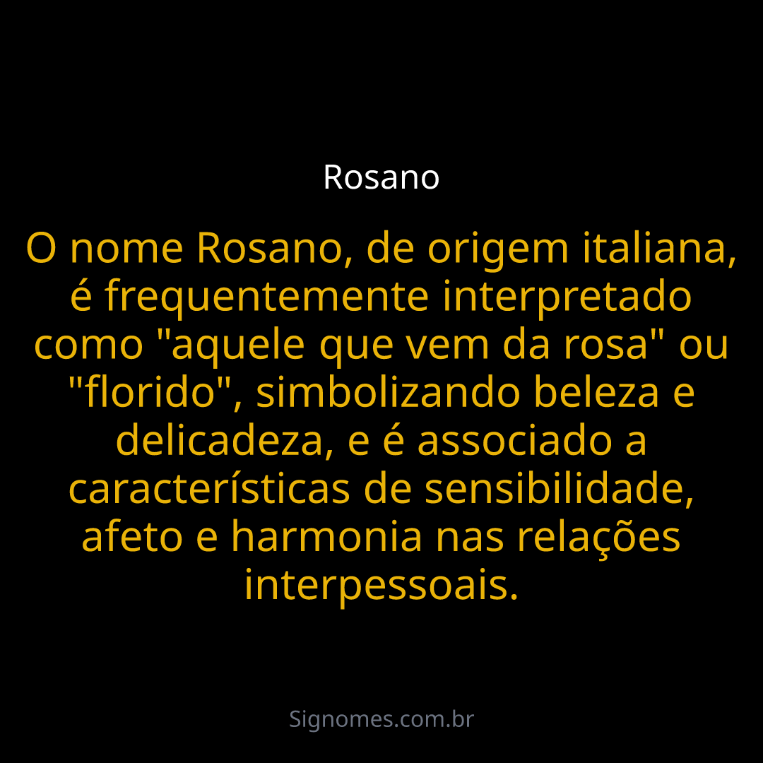 O nome Rosano, de origem italiana, é frequentemente interpretado como "aquele que vem da rosa" ou "florido", simbolizando beleza e delicadeza, e é associado a características de sensibilidade, afeto e harmonia nas relações interpessoais.