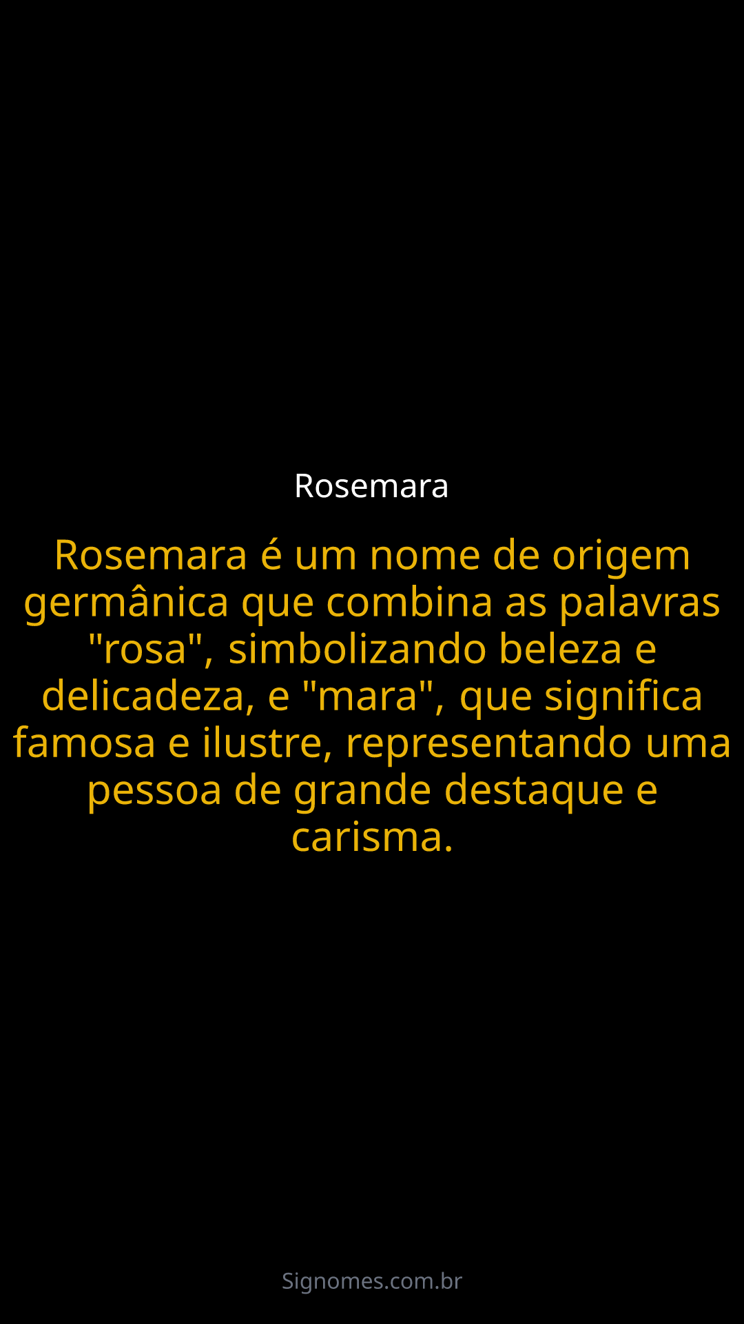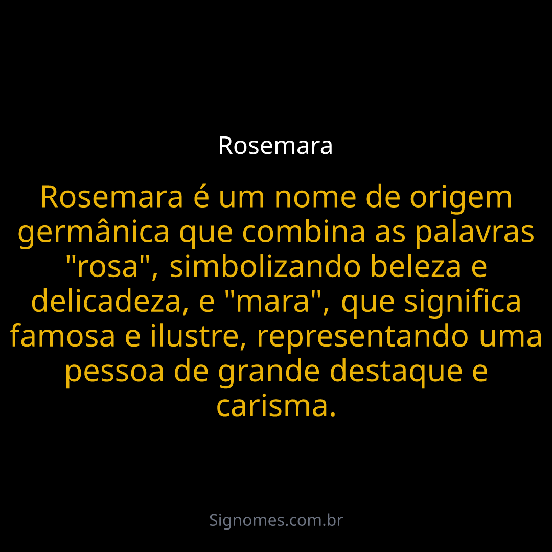 Rosemara é um nome de origem germânica que combina as palavras "rosa", simbolizando beleza e delicadeza, e "mara", que significa famosa e ilustre, representando uma pessoa de grande destaque e carisma.