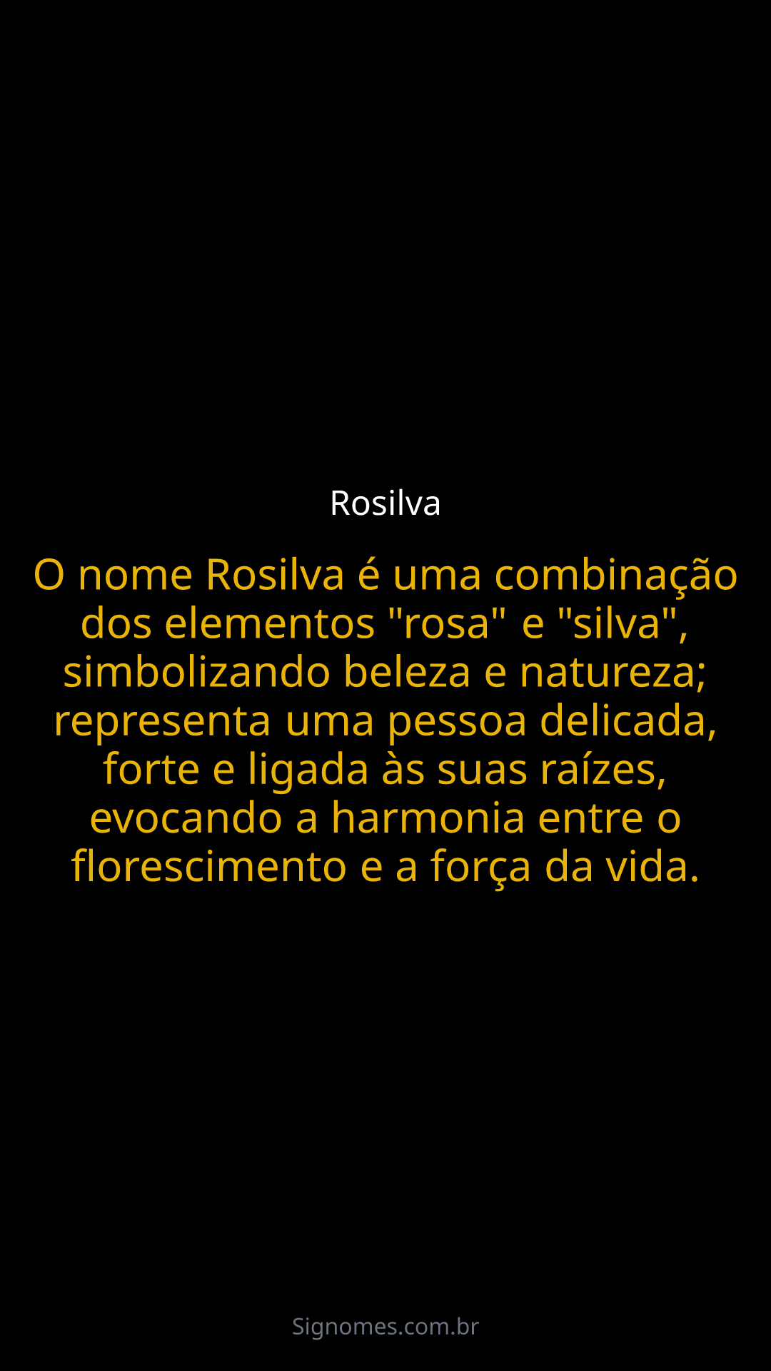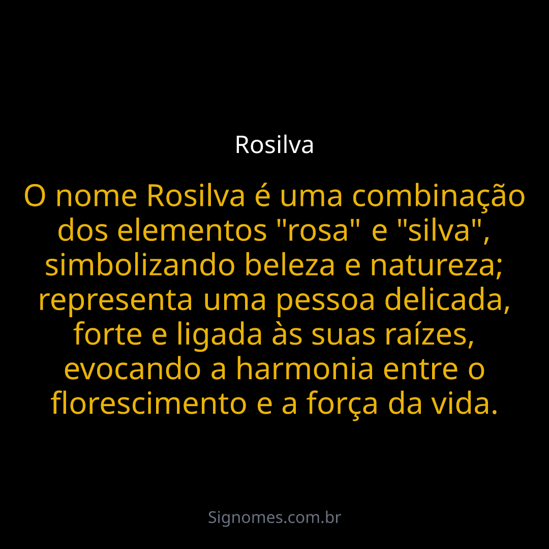 O nome Rosilva é uma combinação dos elementos "rosa" e "silva", simbolizando beleza e natureza; representa uma pessoa delicada, forte e ligada às suas raízes, evocando a harmonia entre o florescimento e a força da vida.