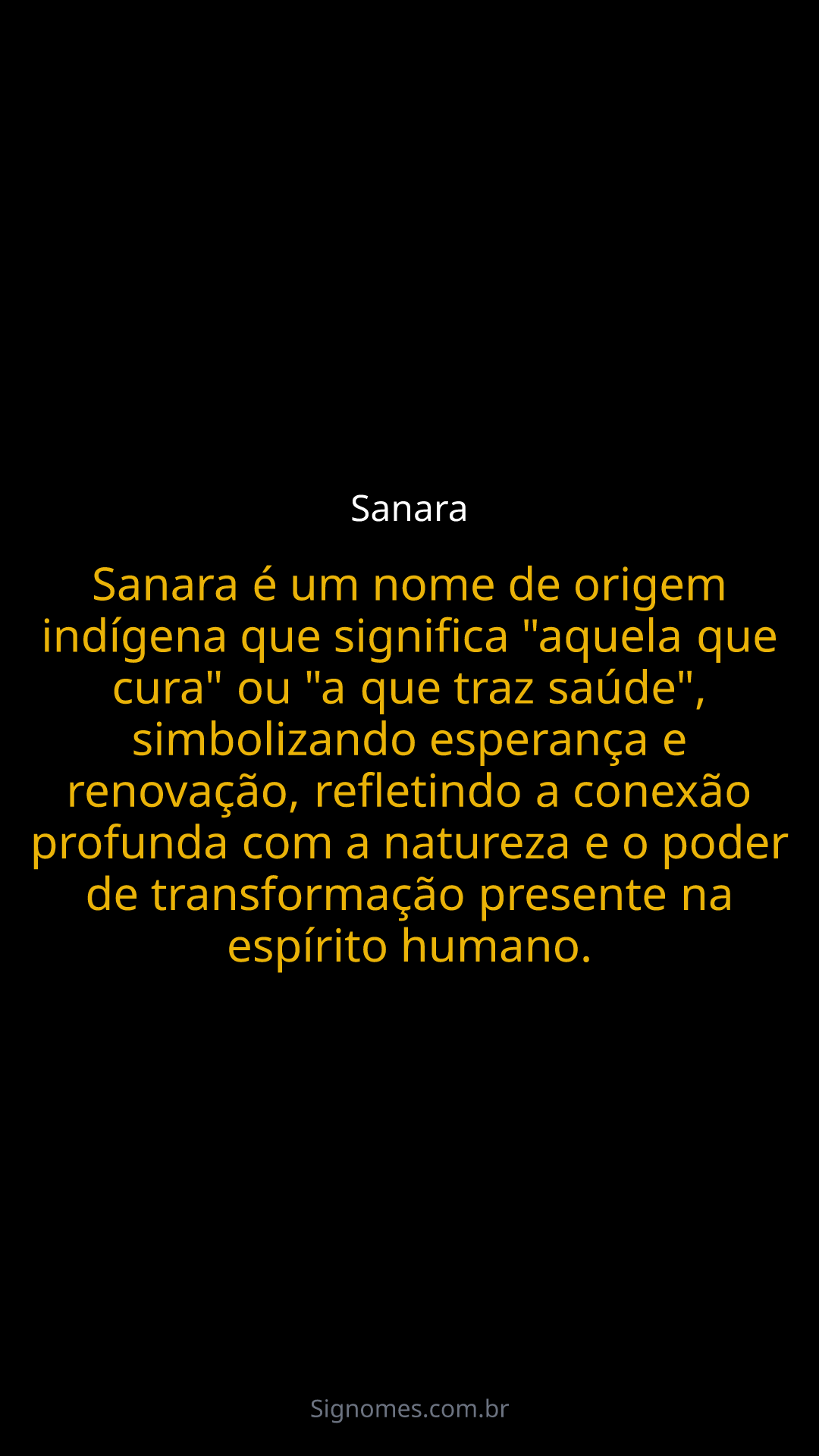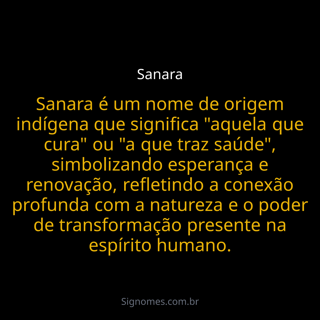 Sanara é um nome de origem indígena que significa "aquela que cura" ou "a que traz saúde", simbolizando esperança e renovação, refletindo a conexão profunda com a natureza e o poder de transformação presente na espírito humano.