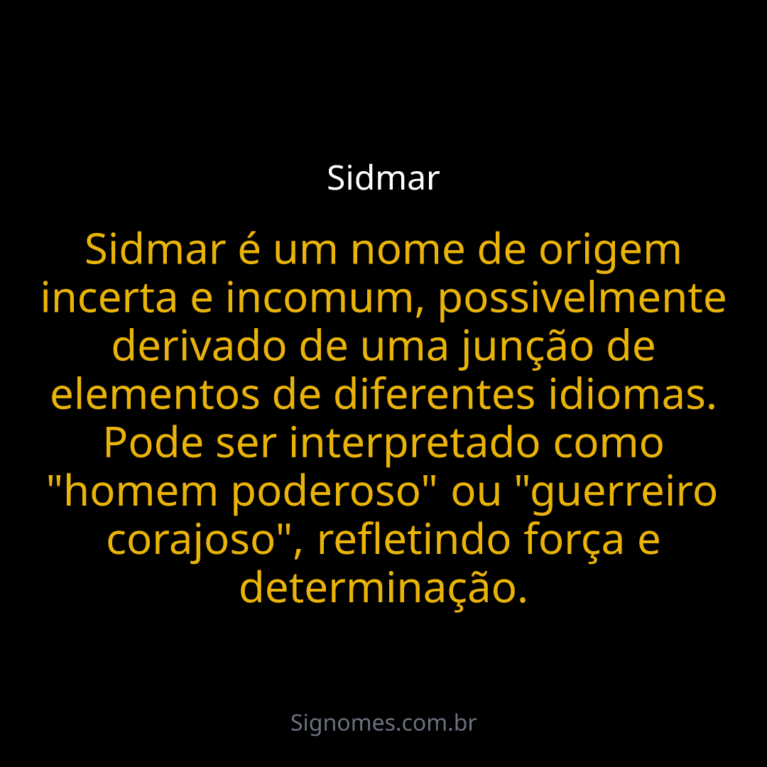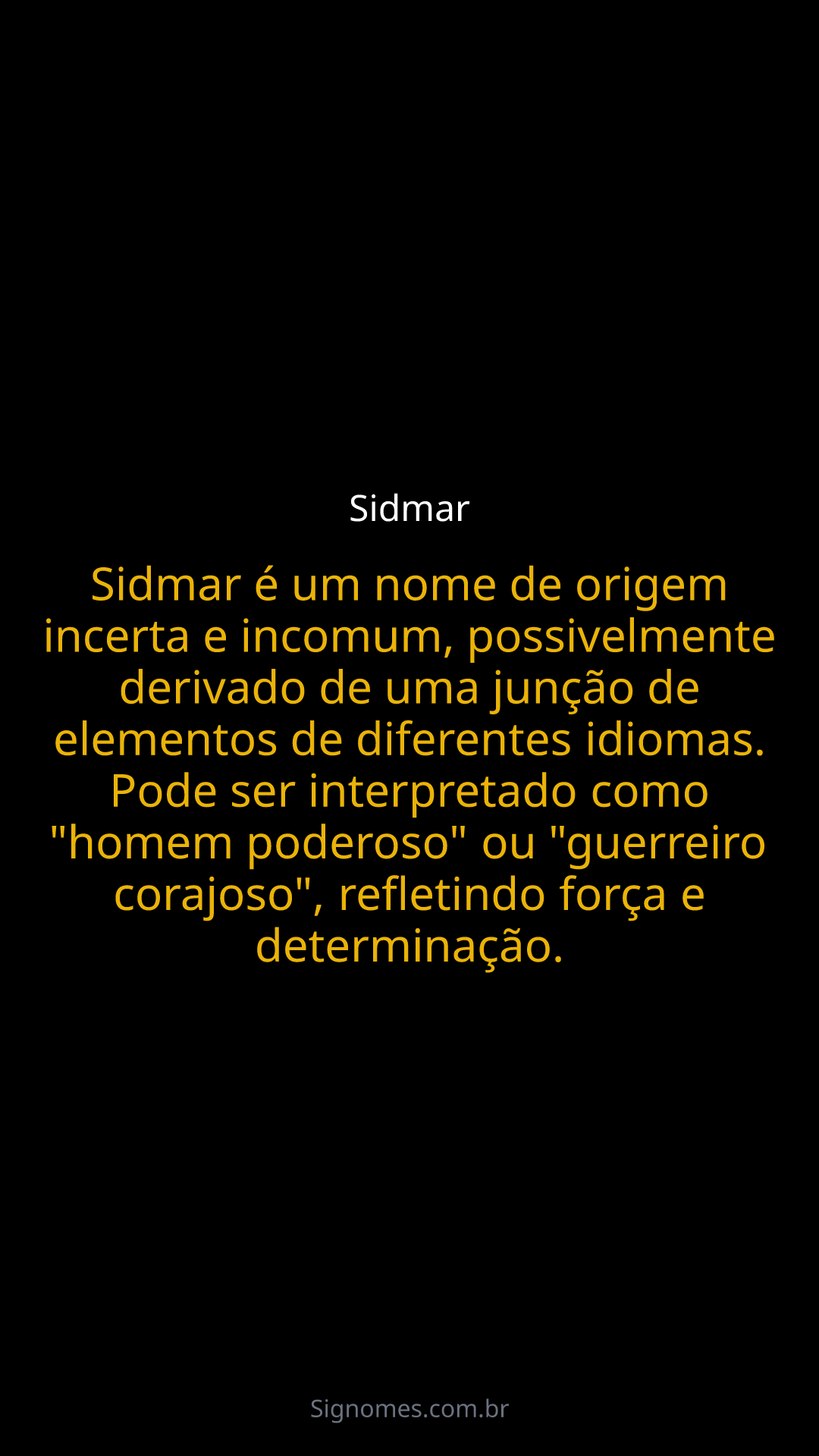Sidmar é um nome de origem incerta e incomum, possivelmente derivado de uma junção de elementos de diferentes idiomas. Pode ser interpretado como "homem poderoso" ou "guerreiro corajoso", refletindo força e determinação.