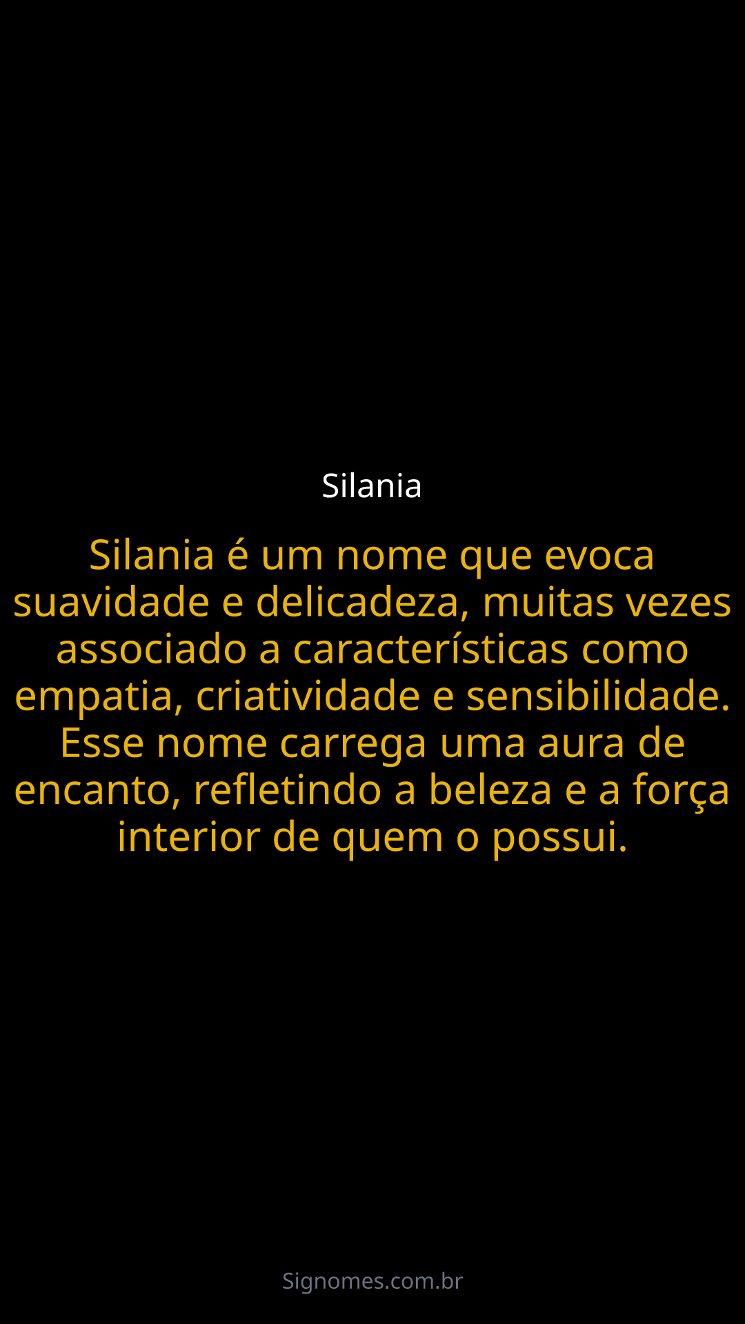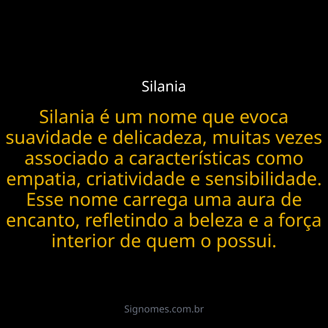 Silania é um nome que evoca suavidade e delicadeza, muitas vezes associado a características como empatia, criatividade e sensibilidade. Esse nome carrega uma aura de encanto, refletindo a beleza e a força interior de quem o possui.
