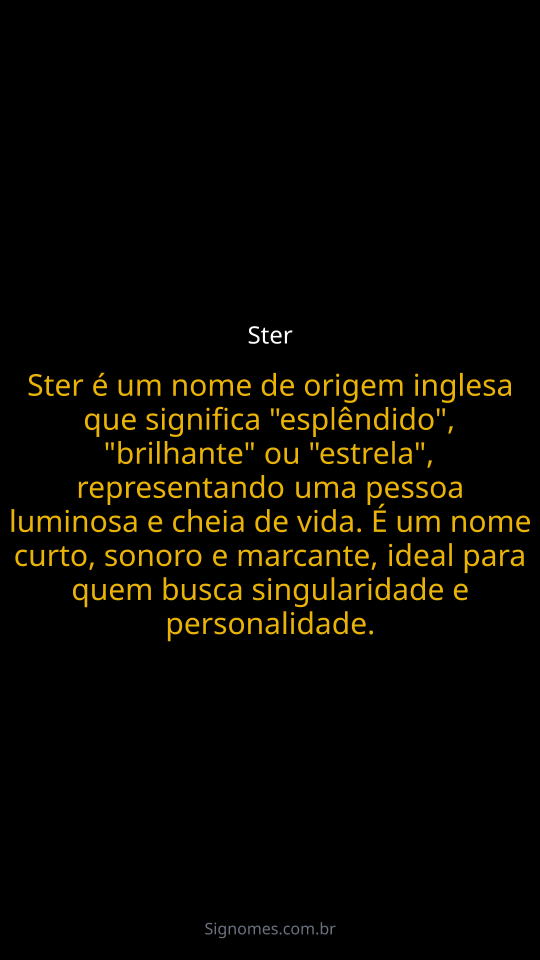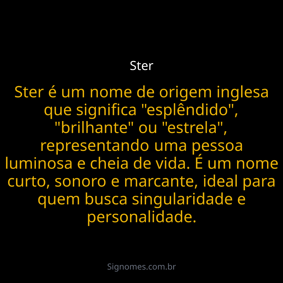 Ster é um nome de origem inglesa que significa "esplêndido", "brilhante" ou "estrela", representando uma pessoa luminosa e cheia de vida. É um nome curto, sonoro e marcante, ideal para quem busca singularidade e personalidade.