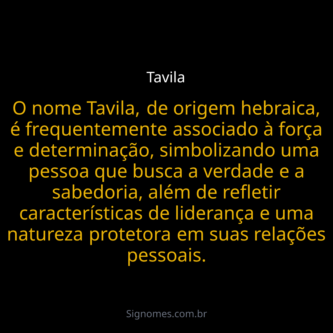 O nome Tavila, de origem hebraica, é frequentemente associado à força e determinação, simbolizando uma pessoa que busca a verdade e a sabedoria, além de refletir características de liderança e uma natureza protetora em suas relações pessoais.