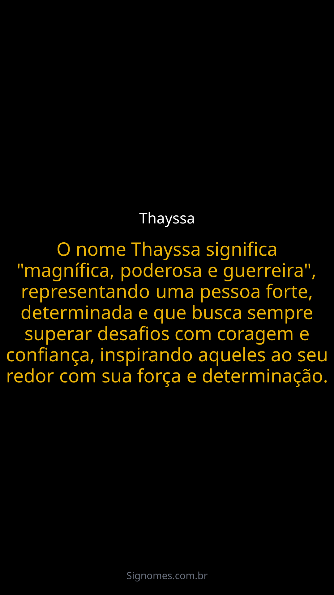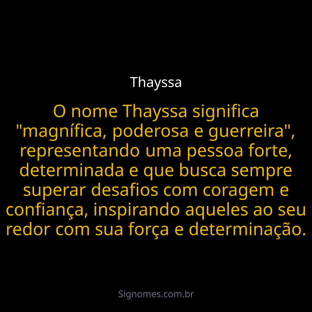 O nome Thayssa significa "magnífica, poderosa e guerreira", representando uma pessoa forte, determinada e que busca sempre superar desafios com coragem e confiança, inspirando aqueles ao seu redor com sua força e determinação.