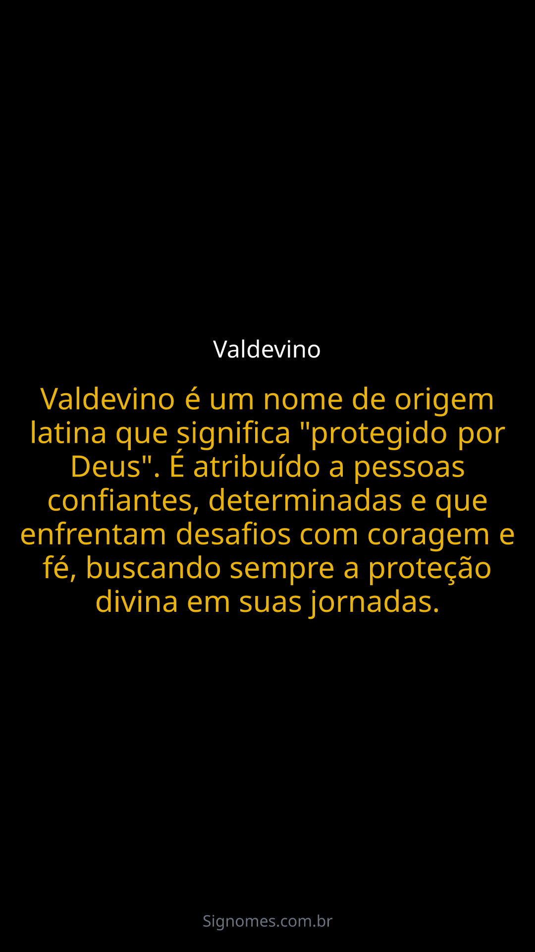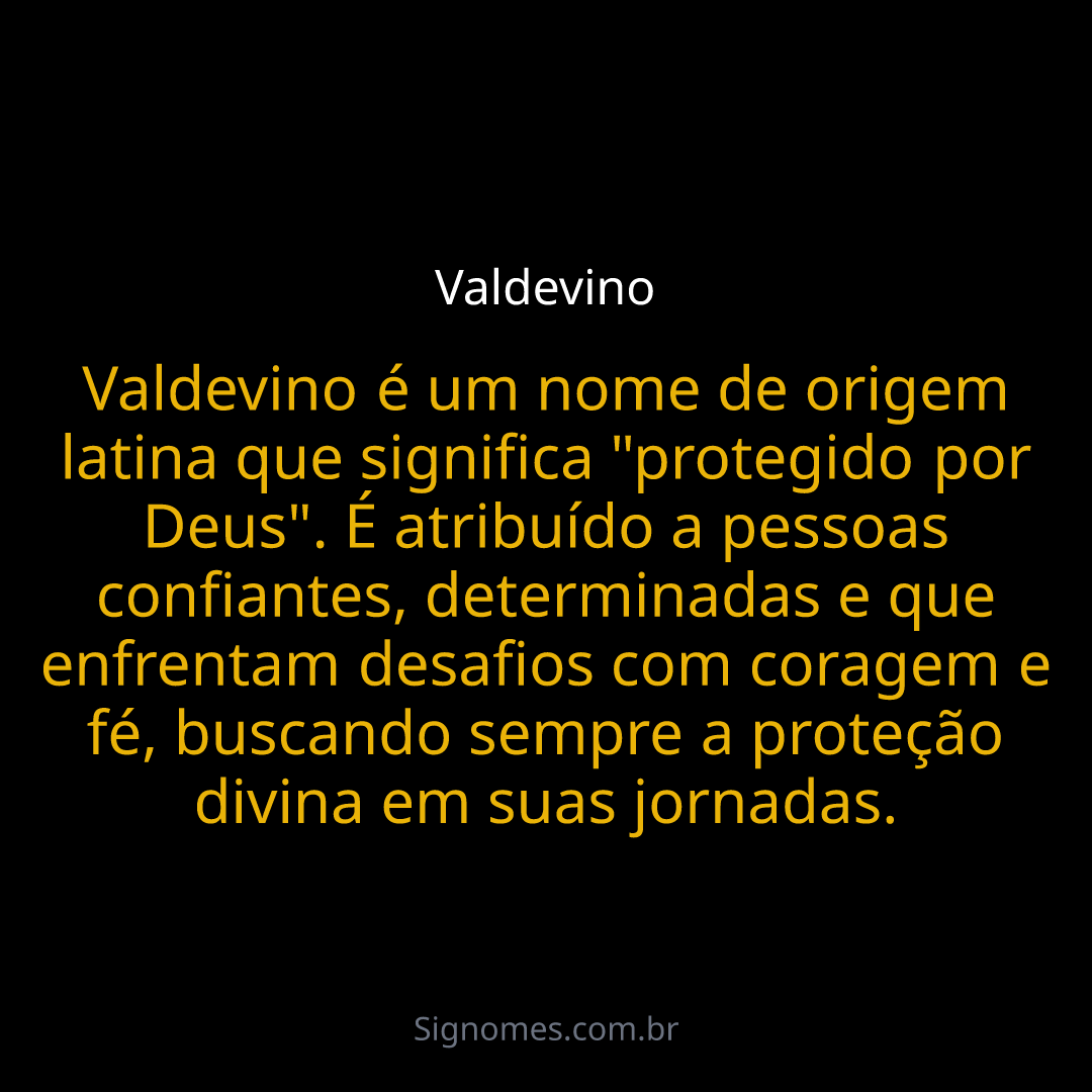 Valdevino é um nome de origem latina que significa "protegido por Deus". É atribuído a pessoas confiantes, determinadas e que enfrentam desafios com coragem e fé, buscando sempre a proteção divina em suas jornadas.