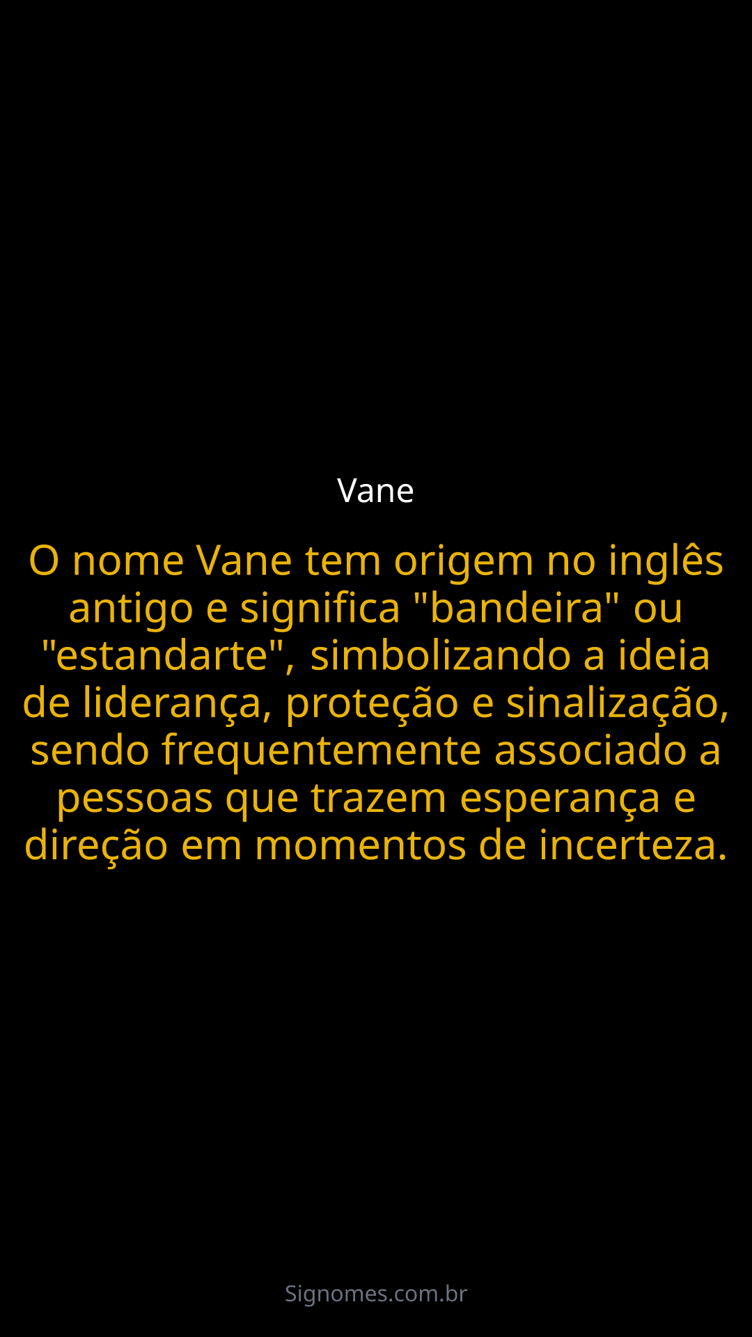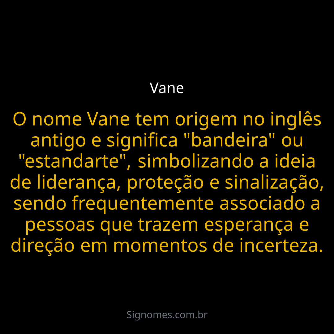 O nome Vane tem origem no inglês antigo e significa "bandeira" ou "estandarte", simbolizando a ideia de liderança, proteção e sinalização, sendo frequentemente associado a pessoas que trazem esperança e direção em momentos de incerteza.