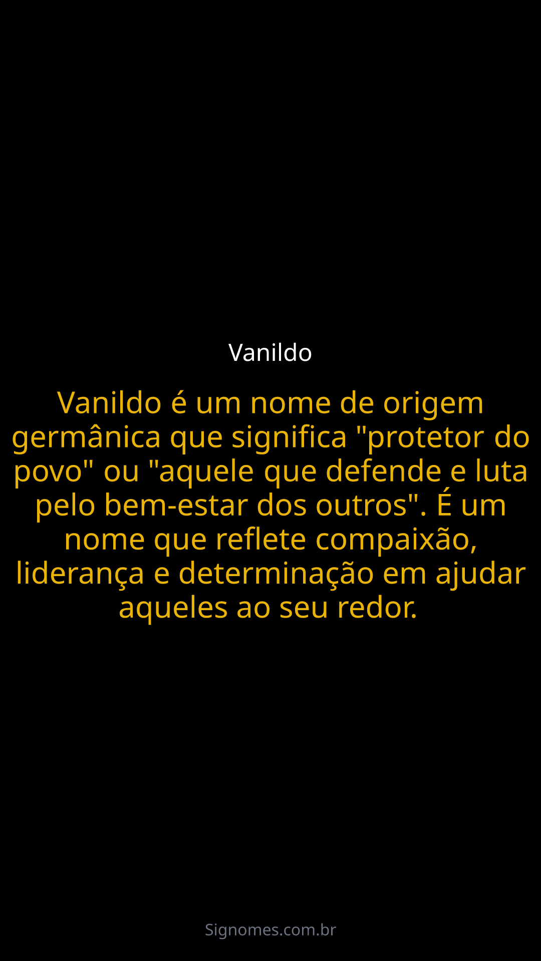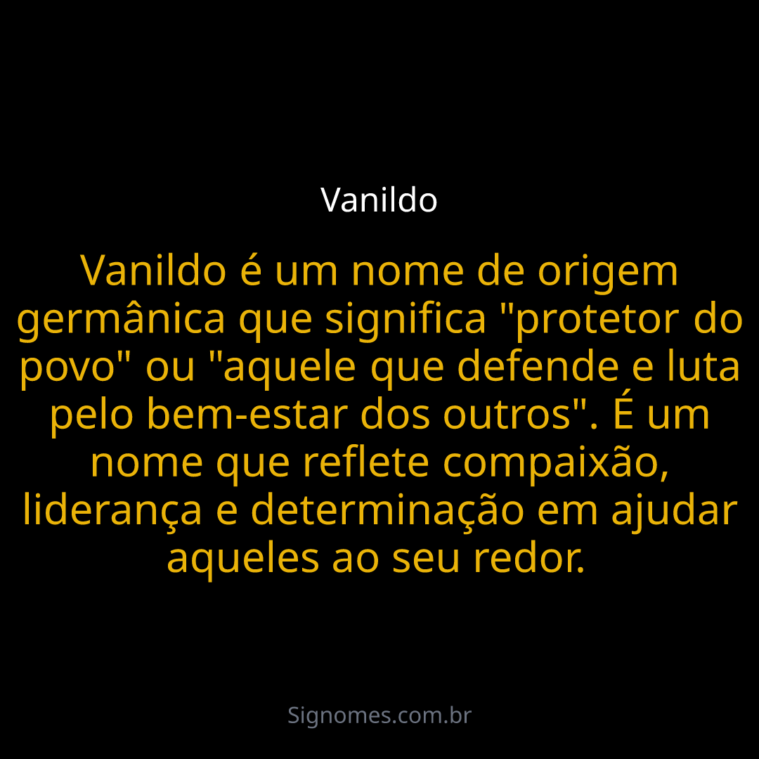 Vanildo é um nome de origem germânica que significa "protetor do povo" ou "aquele que defende e luta pelo bem-estar dos outros". É um nome que reflete compaixão, liderança e determinação em ajudar aqueles ao seu redor.