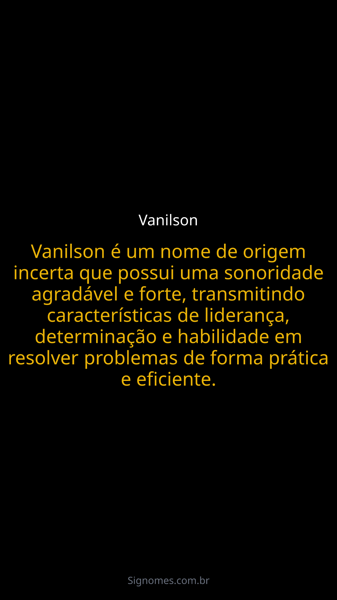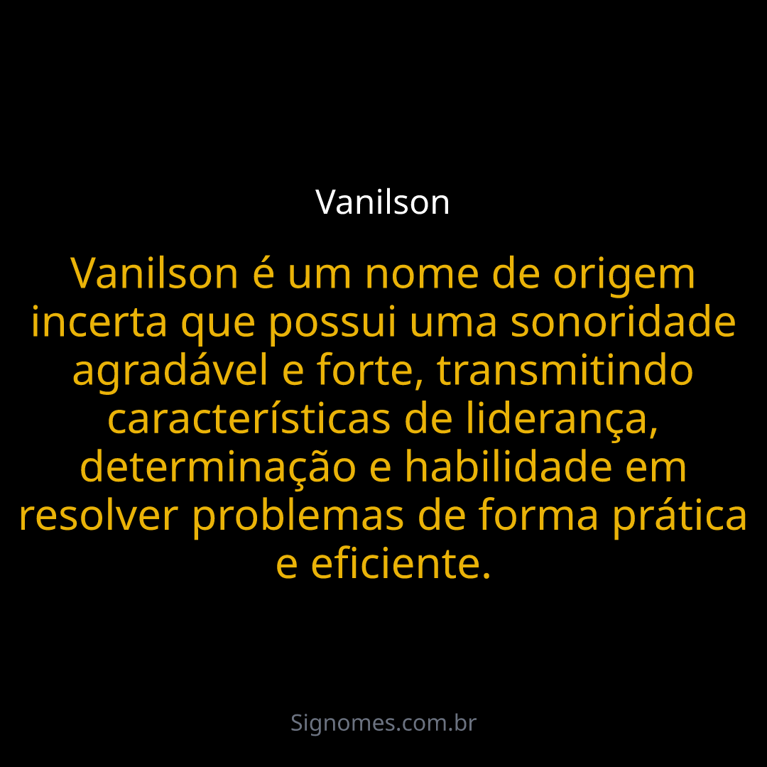 Vanilson é um nome de origem incerta que possui uma sonoridade agradável e forte, transmitindo características de liderança, determinação e habilidade em resolver problemas de forma prática e eficiente.