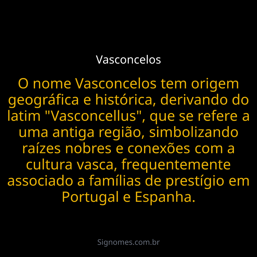 O nome Vasconcelos tem origem geográfica e histórica, derivando do latim "Vasconcellus", que se refere a uma antiga região, simbolizando raízes nobres e conexões com a cultura vasca, frequentemente associado a famílias de prestígio em Portugal e Espanha.