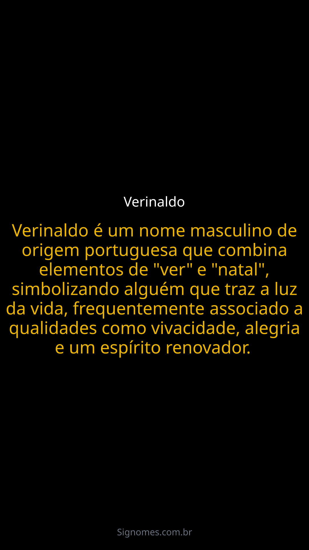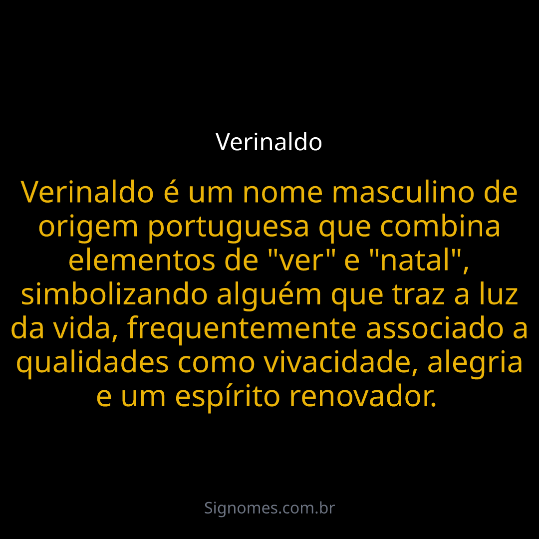 Verinaldo é um nome masculino de origem portuguesa que combina elementos de "ver" e "natal", simbolizando alguém que traz a luz da vida, frequentemente associado a qualidades como vivacidade, alegria e um espírito renovador.