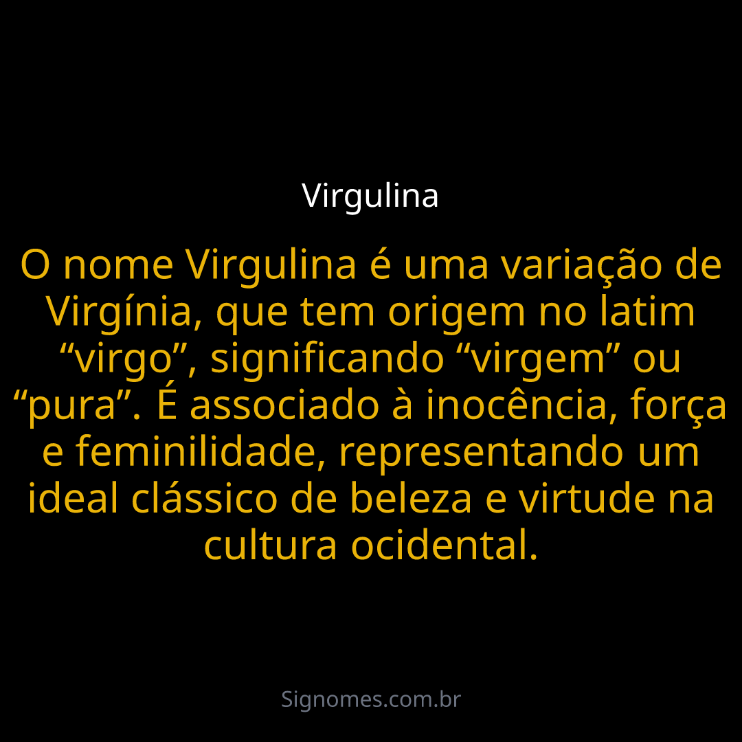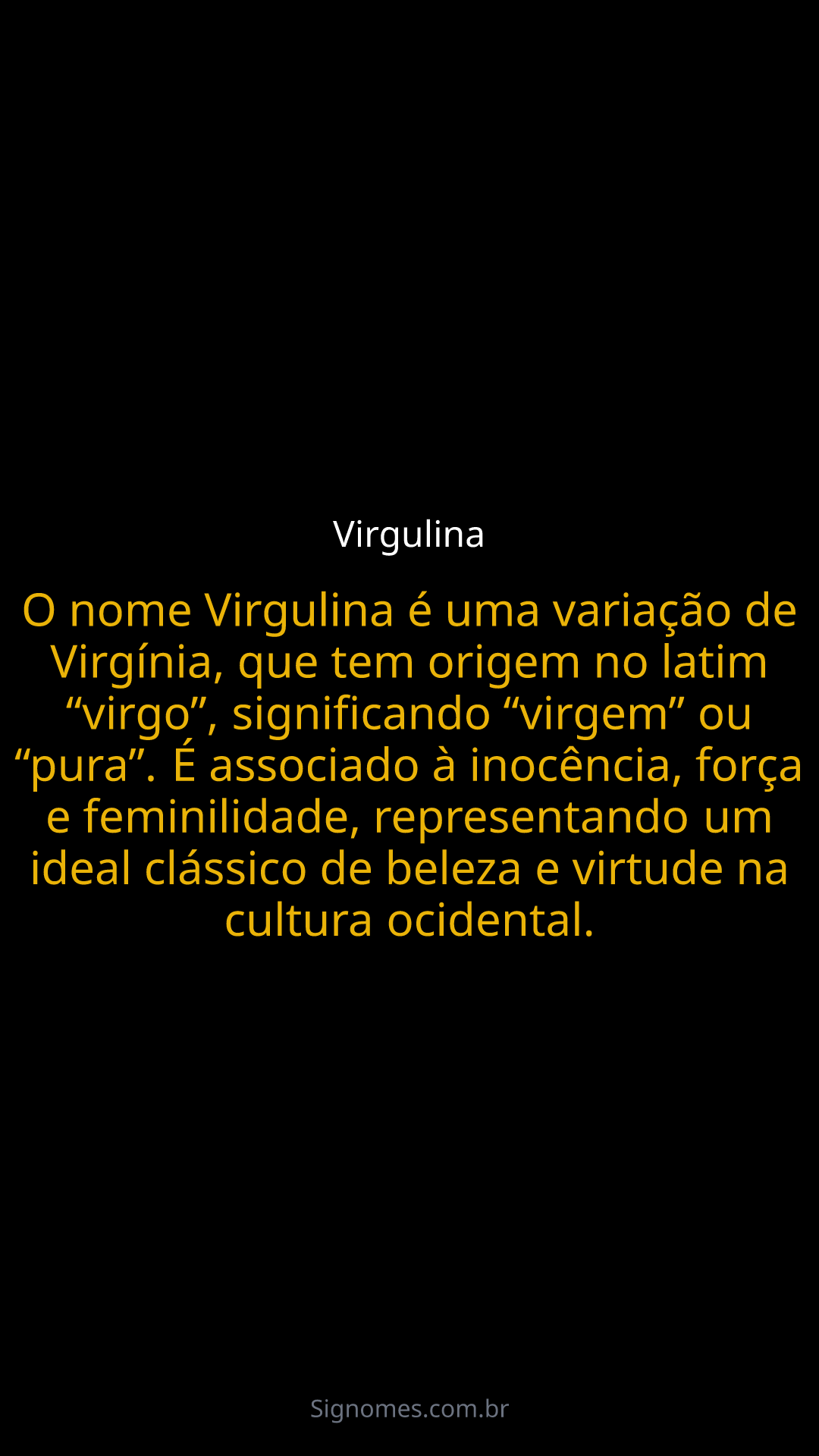 O nome Virgulina é uma variação de Virgínia, que tem origem no latim “virgo”, significando “virgem” ou “pura”. É associado à inocência, força e feminilidade, representando um ideal clássico de beleza e virtude na cultura ocidental.