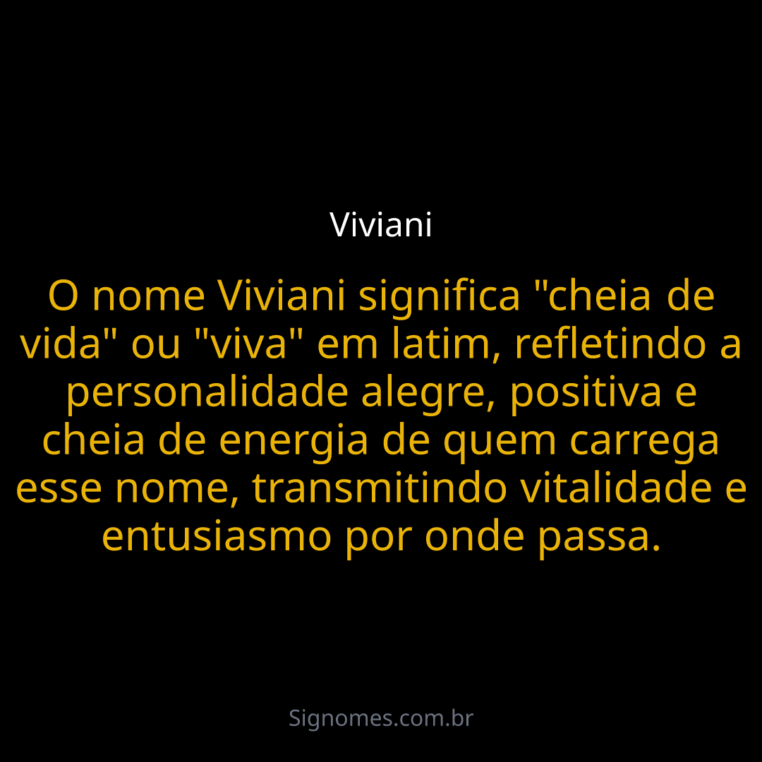 O nome Viviani significa "cheia de vida" ou "viva" em latim, refletindo a personalidade alegre, positiva e cheia de energia de quem carrega esse nome, transmitindo vitalidade e entusiasmo por onde passa.
